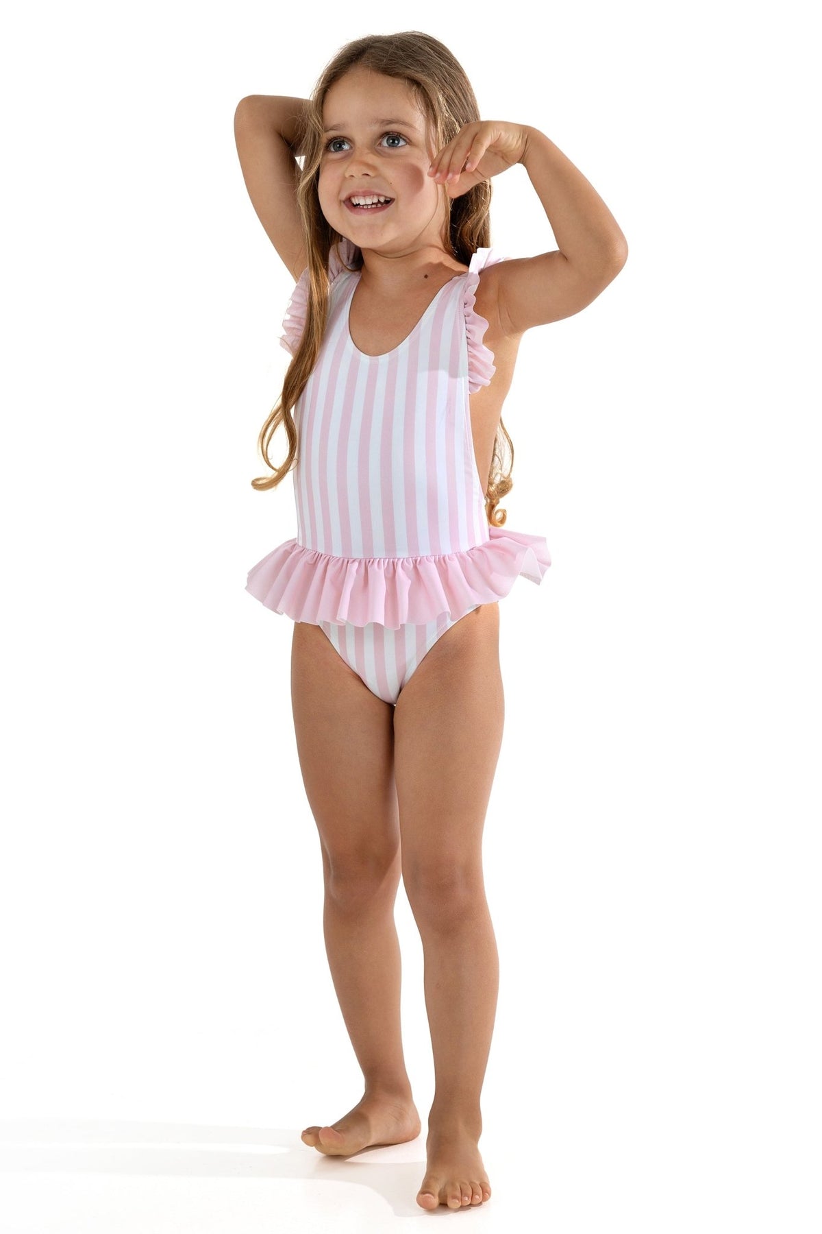 مايوه مخطط للبنات من العلامة التجارية البرتغالية Meia Pata . بدلة سباحة مخططة باللون الوردي الفاتح مصنوعة من الليكرا مع كشكشة وردية فاتحة على الأشرطة وحول الخصر، ومزينة بقوس وردي فاتح كبير في الخلف.