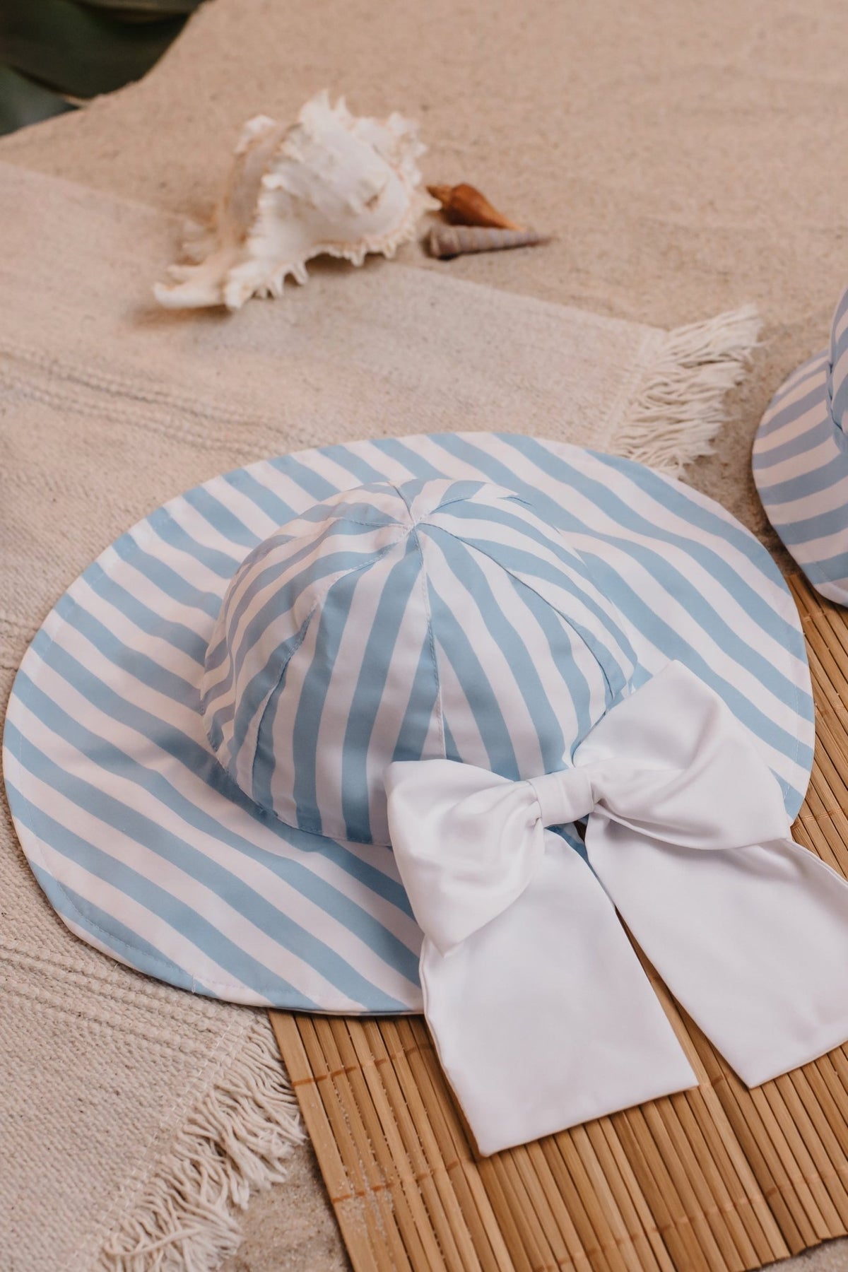 قبعة شمس زرقاء مخططة للبنات من ماركة ميا باتا البرتغالية. قبعة ناعمة جدًا من الليكرا، مخططة باللونين الأزرق والأبيض، مزينة بفيونكة بيضاء كبيرة.