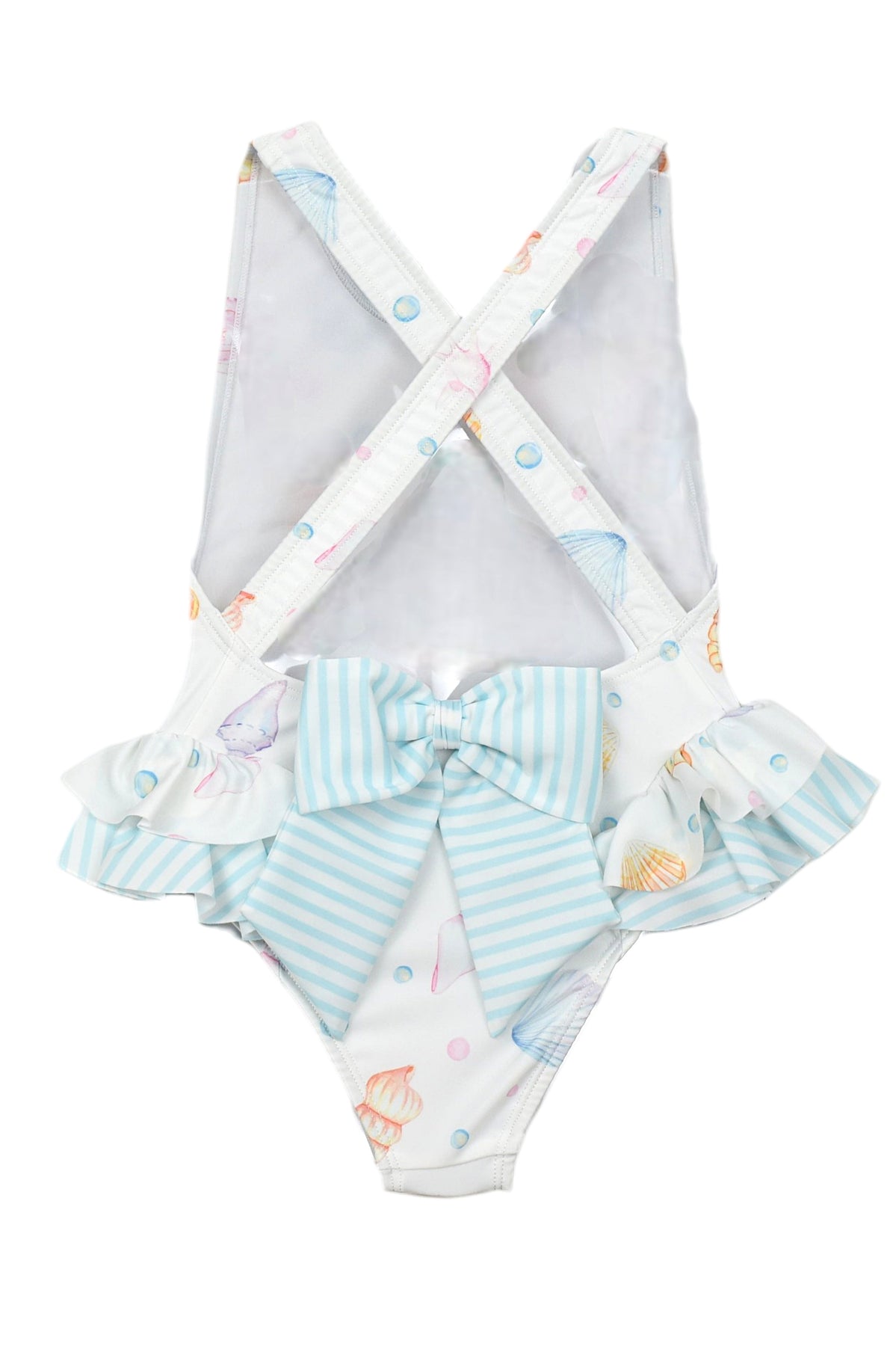 Soft, dreamy and made for sun-soaked days, the Meia Pata Bahamas swimsuit in the Seashells print is a beautiful choice for little beach lovers. Featuring a delicate pastel seashell design on a creamy base, it’s finished with sweet ruffle trims and a statement striped bow at the back for an extra-special touch.
