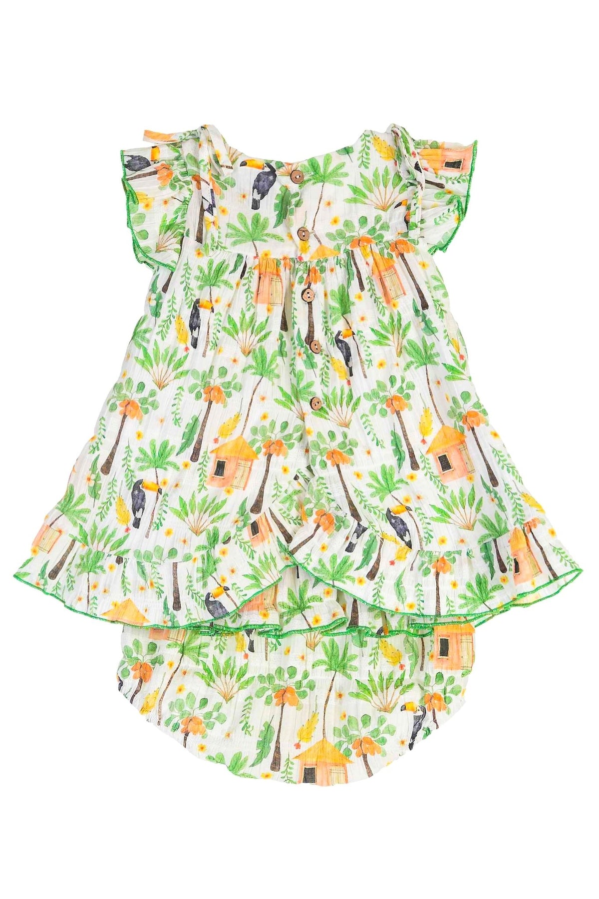 طقم فستان بناتي من ماركة تارتاليتا الإسبانية. فستان قطني خفيف الوزن بطبعة غابة، يتميز بظهر منسدل أنيق وعقدة على الكتفين. يُكمل الطقم سروال داخلي متناسق.