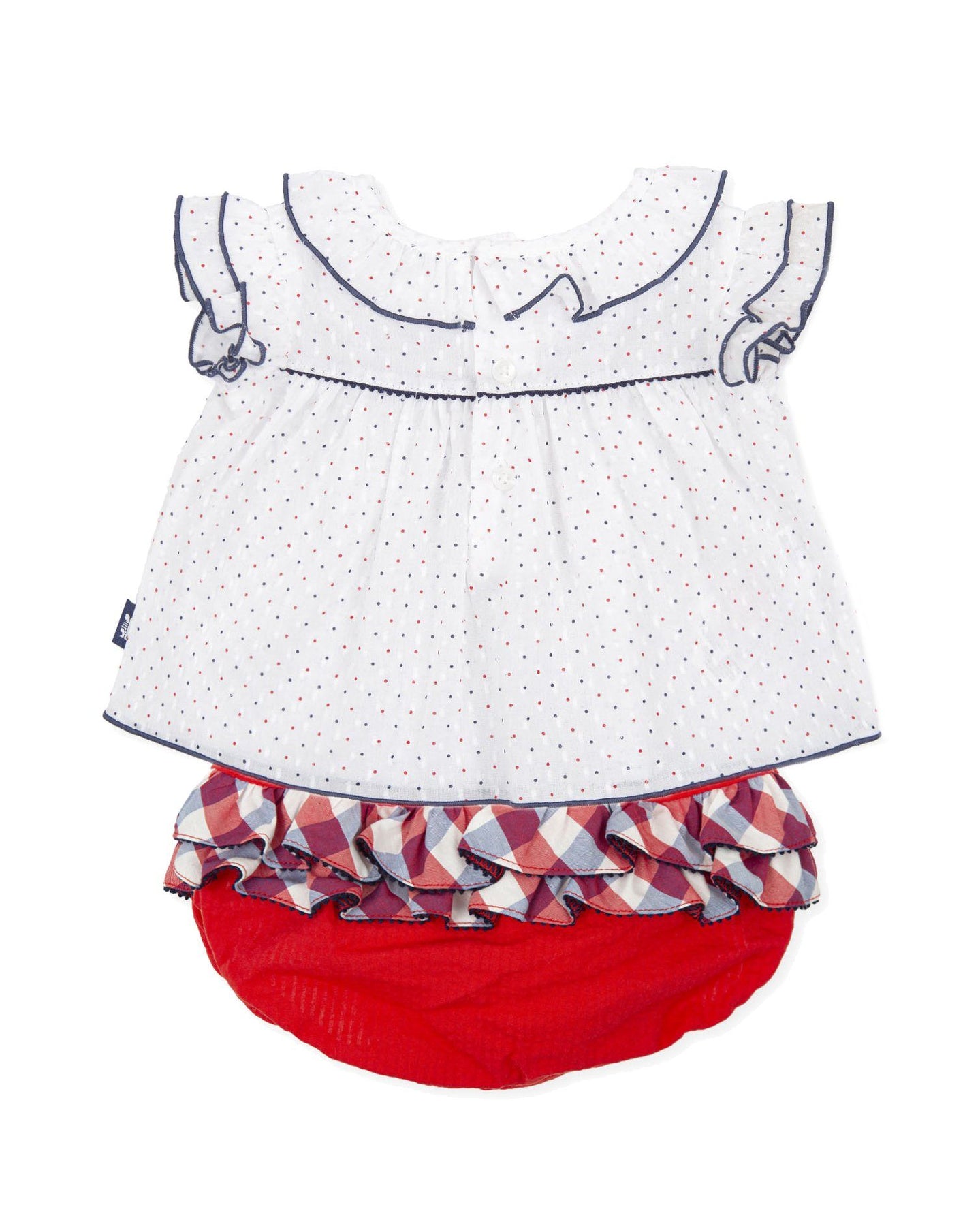 طقم ملابس نابض بالحياة من ماركة توتو بيكولو الإسبانية. بلوزة خفيفة الوزن للغاية من قماش بلوميتي منقوش باللونين الأحمر والكحلي، مع ياقة وأكمام بكشكشة أنيقة، مع سروال داخلي أحمر منقوش بكشكشة منقوشة بالأحمر والكحلي والأبيض على المؤخرة.