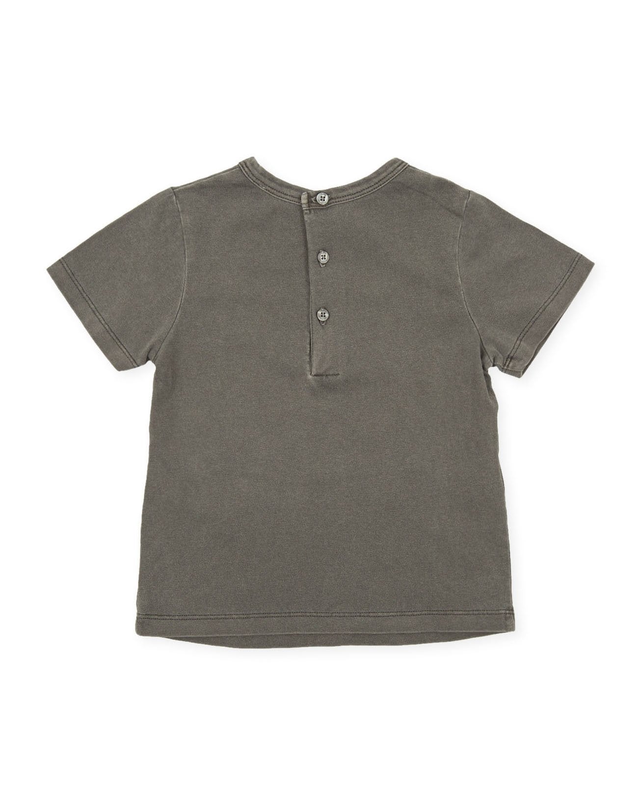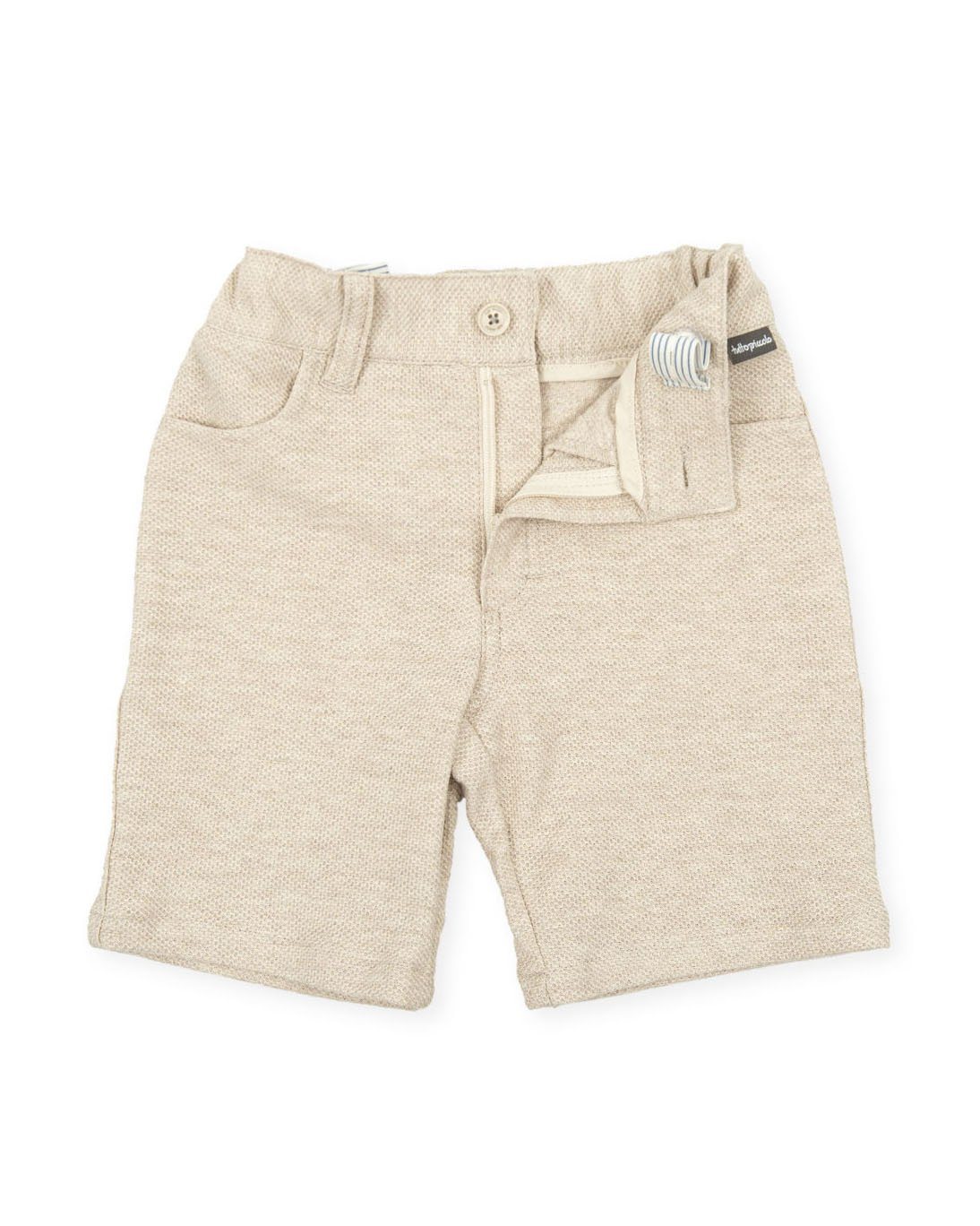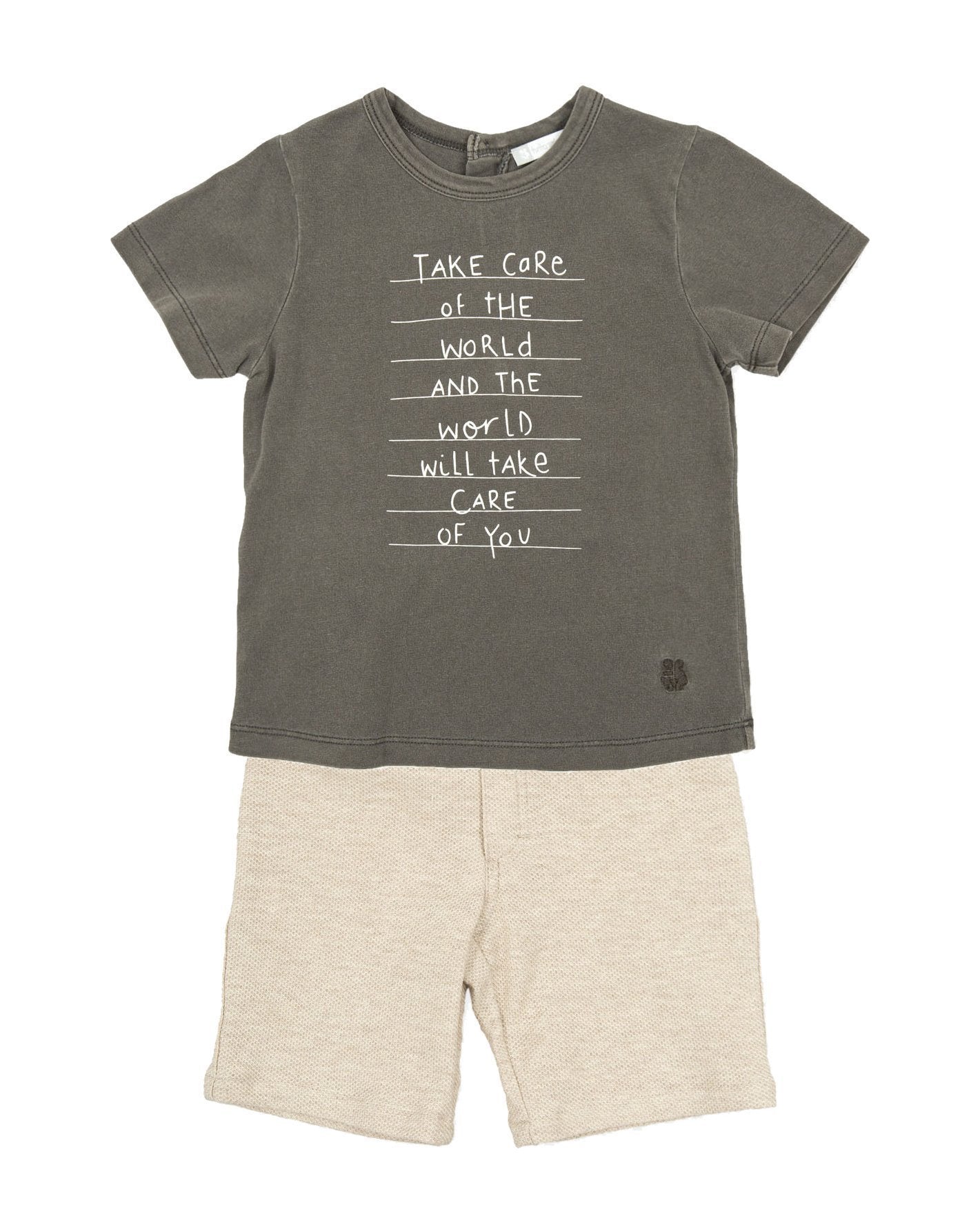 طقم ملابس أنيق من العلامة الإسبانية توتو بيكولو . تيشيرت رمادي قطني ناعم للغاية بشعار "خذ بطاقة العالم" الأبيض الجذاب، مع شورت قطني محبوك أنيق بلون بيج.