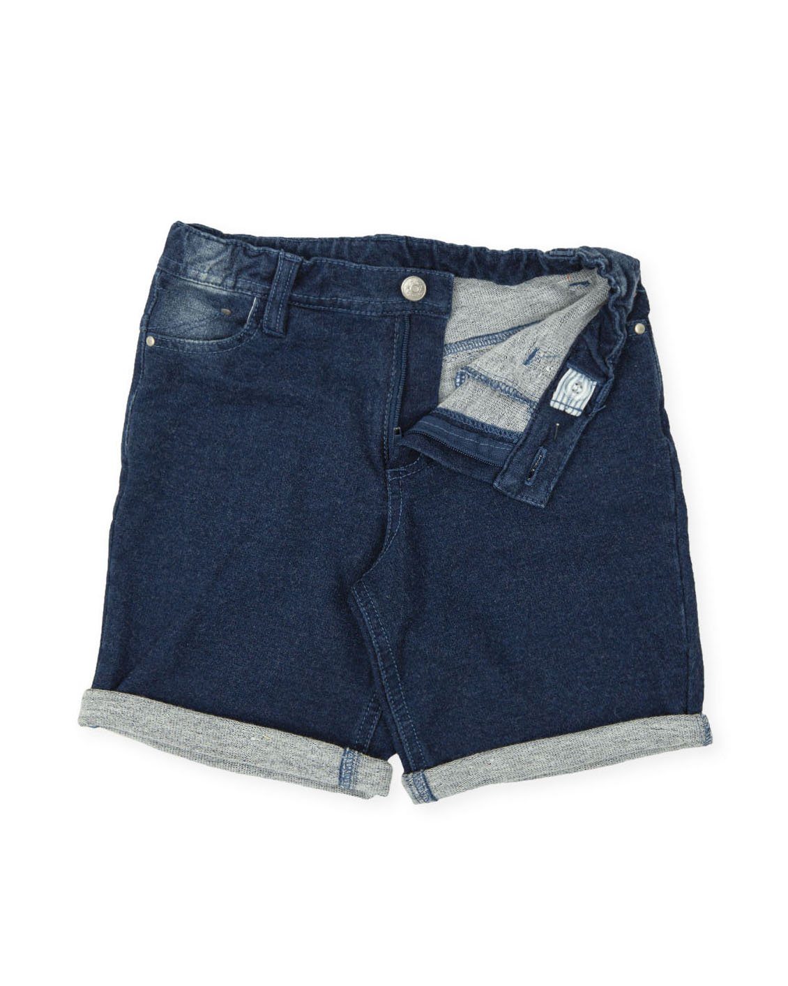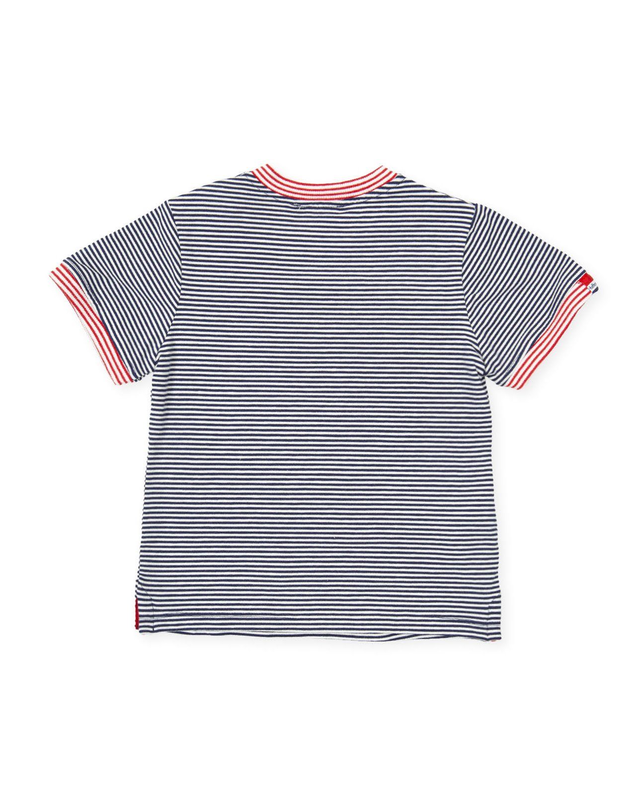 طقم ملابس أنيق من ماركة توتو بيكولو الإسبانية. تيشيرت ناعم للغاية مخطط باللونين الأزرق والأبيض، برقبة وأكمام مخططة باللون الأحمر المتباين، مزين بنقشة مرساة بارزة في المنتصف، مع شورت جينز ناعم بأكمام مطوية.