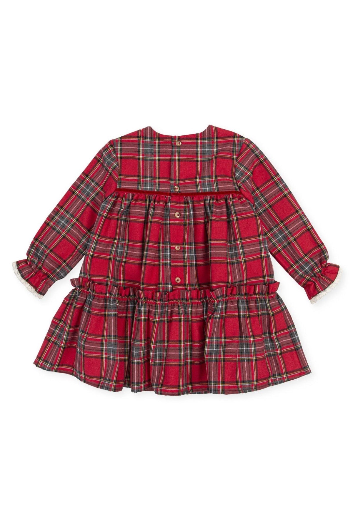 فستان أحمر منقوش بنقشة تارتان احتفالية من ماركة توتو بيكولو الإسبانية. فستان أحمر خفيف منقوش بنقشة تارتان بأكمام طويلة، مع فيونكة مخملية حمراء أنيقة على الصدر، وتفاصيل دانتيل كروشيه بيضاء على الصدر والأكمام.