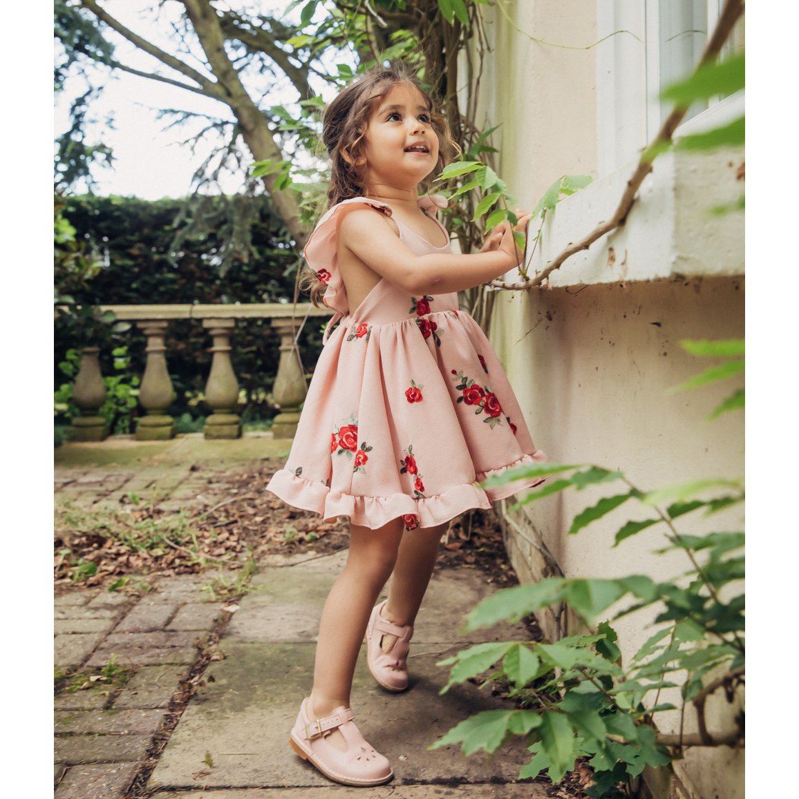يتميز فستان إليانا بورود حمراء متناغمة مطرزة على قماش كريب وردي داكن خفيف الوزن.