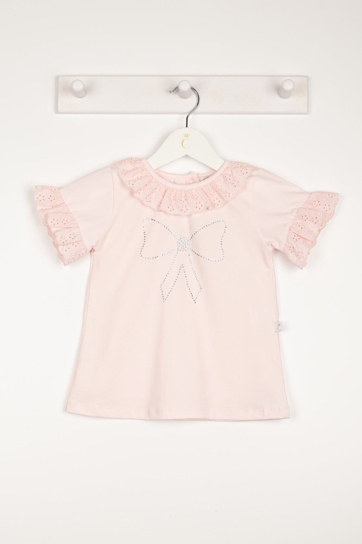 تيشيرت وردي أنيق من مجموعة ربيع وصيف ٢٠٢٢ للعلامة التجارية البريطانية كاراميلو للأطفال . مصنوع من قطن الجيرسيه الوردي الناعم، مزين بكشكشة وردية مطرزة بتطريز إنجليزي على الرقبة والأكمام، ومزين بفيونكة ماسية على الصدر.