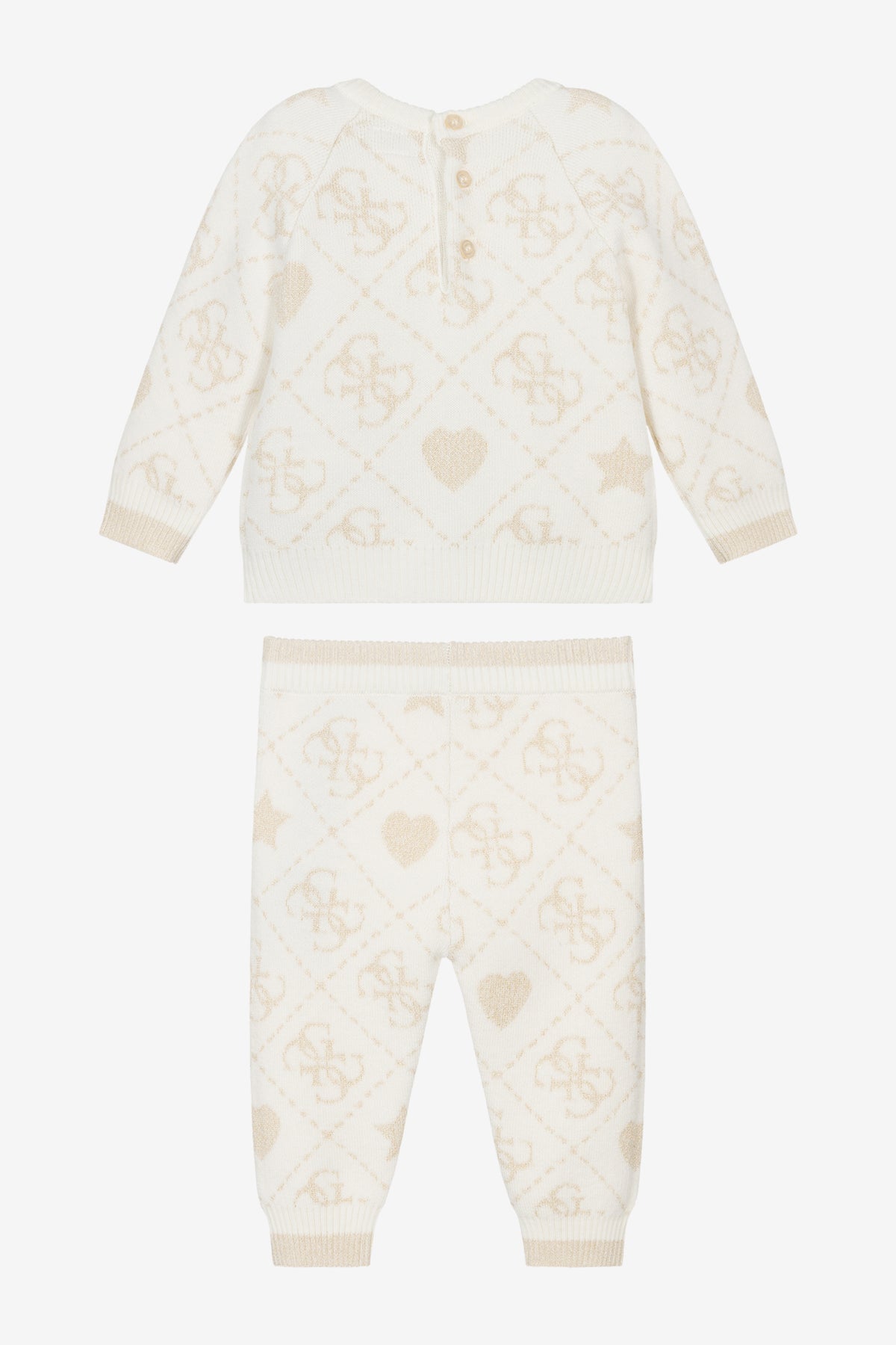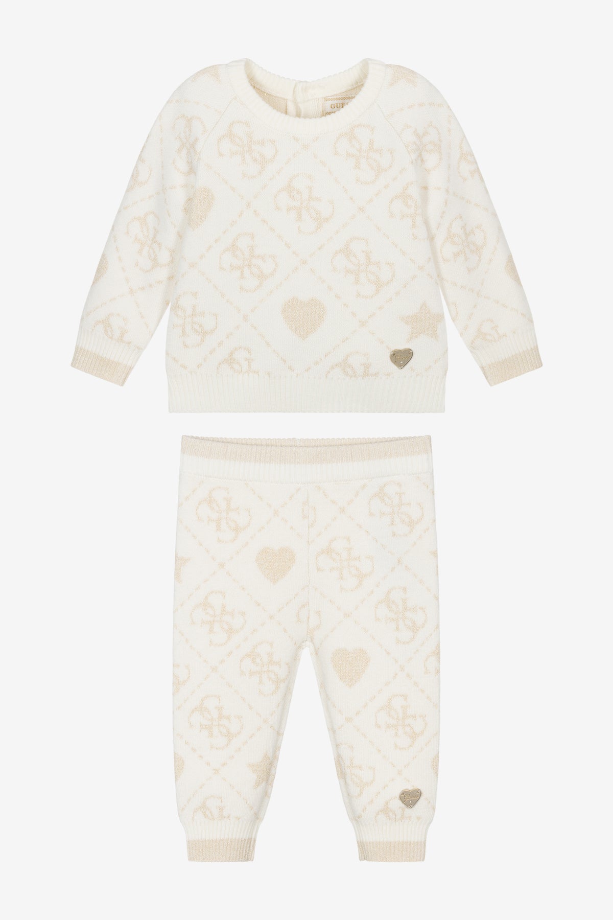 Wrap your little one in pure comfort and sparkle with this beautiful ivory knitted set from GUESS® Kids. Crafted from a super soft, stretchy blend with a touch of wool, it’s the perfect cosy outfit for special days or snuggly afternoons at home. The shimmer of gold lurex woven through the monogram pattern adds a subtle festive charm, while the gold-tone heart detailing completes the look with signature GUESS® elegance.