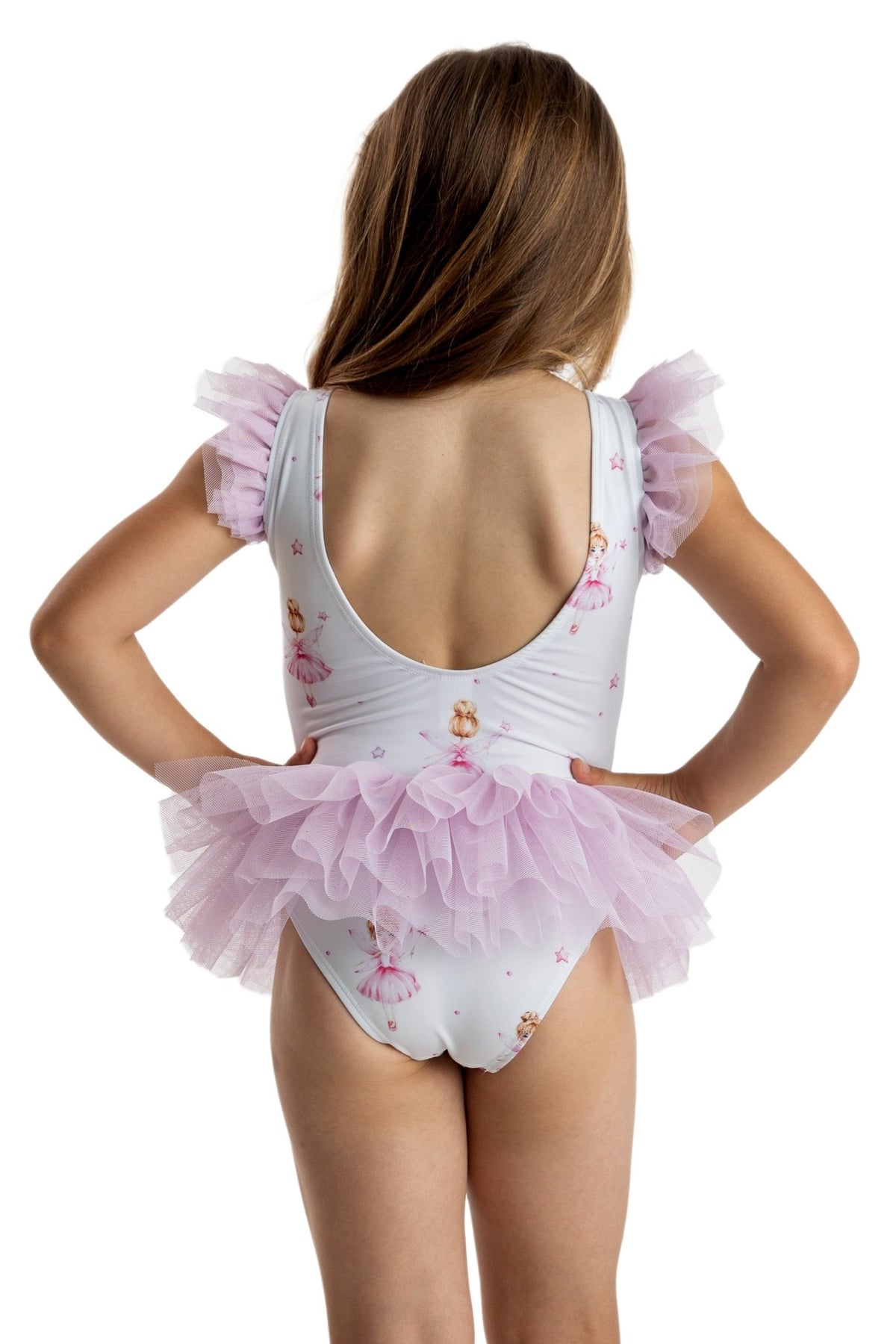 مايوه سباحة بطبعة راقصة باليه للبنات من ماركة ميا باتا البرتغالية . مصنوع من الليكرا الناعم باللونين الأبيض والوردي، مزين بكشكشة من التول الوردي الناعم على الأكمام، مع تنورة توتو وردية قابلة للإزالة.
