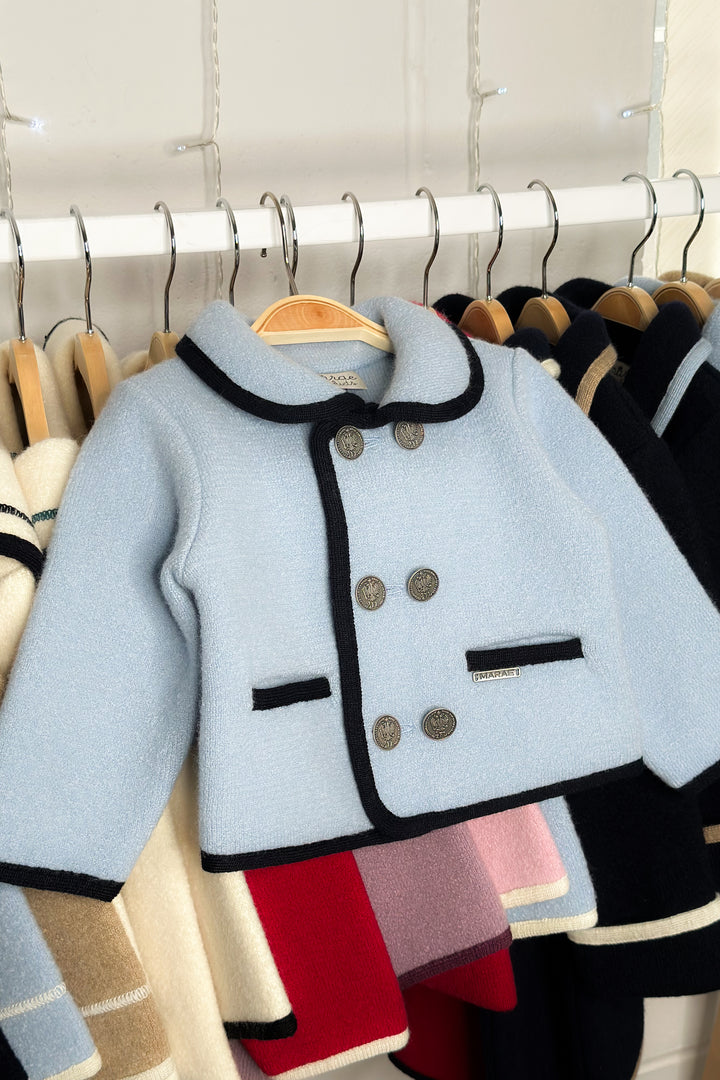 هذا المعطف الأزرق الفاتح الأنيق والخالد، مصنوع يدويًا من صوف ميرينو نمساوي فاخر، ومُزين بحواف زرقاء داكنة. يتميز بياقة عالية وأزرار مزدوجة الصدر لإطلالة راقية.