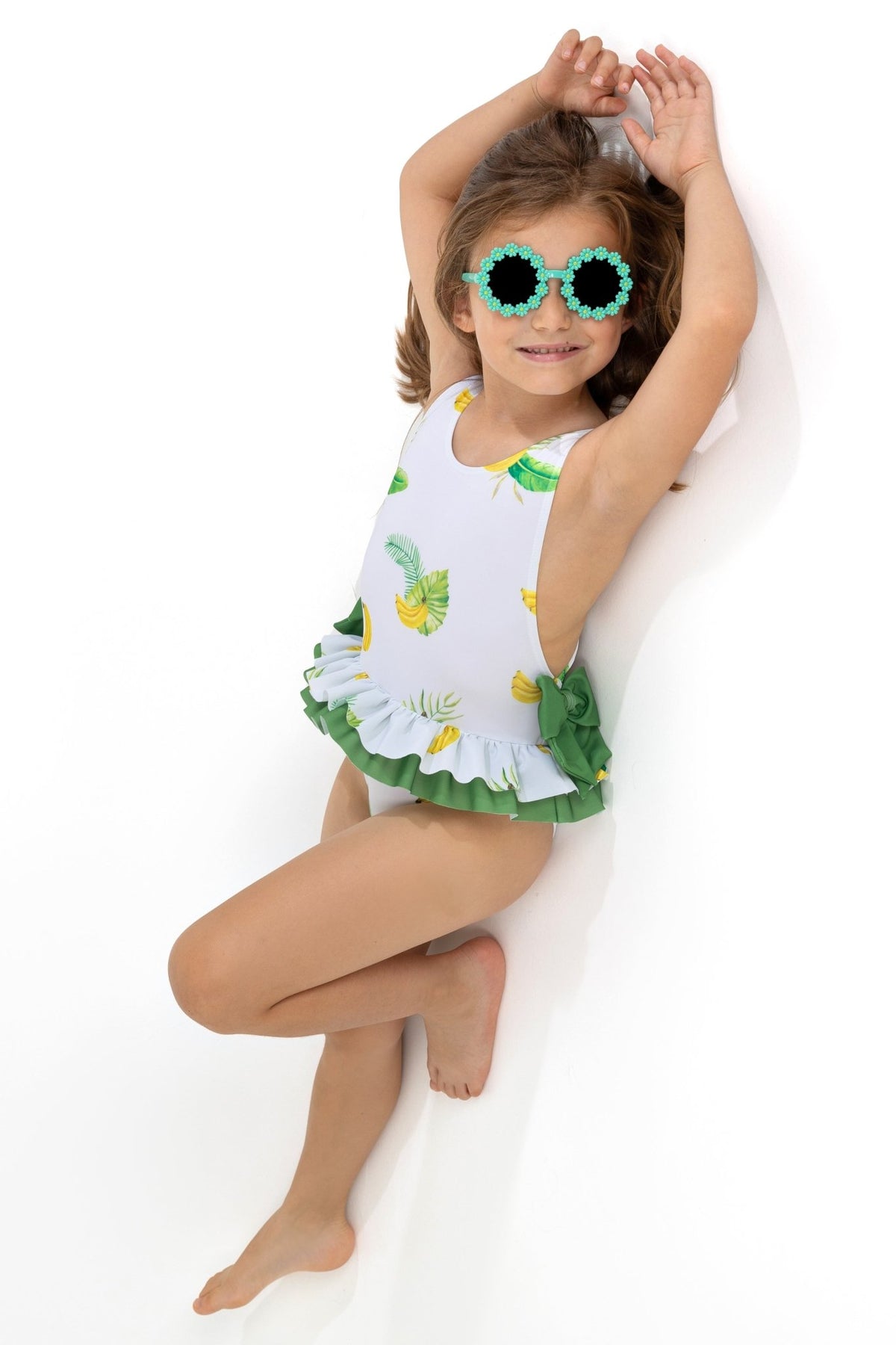 مايوه سباحة بناتي بطبعة استوائية من ماركة ميا باتا البرتغالية. مصنوع من الليكرا الناعم بطبعة أوراق الموز باللون الأبيض والأصفر والأخضر، مع حمالات متقاطعة وتنورة أنثوية مزدوجة الطبقات، ومزين بفيونكتين خضراوين كبيرتين.