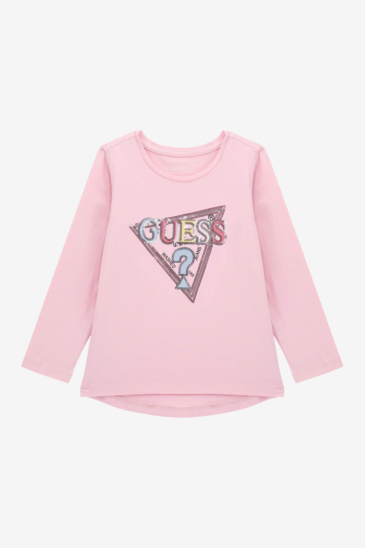 Soft, sweet, and full of sparkle – this GUESS® Kids long-sleeved top adds a touch of shine to her everyday looks. Made from lightweight, stretchy cotton jersey in the prettiest shade of pink, it features the iconic GUESS® triangle logo across the chest, decorated in multicoloured sequins. With popper fastenings to the shoulder on baby sizes for easy dressing, it’s the perfect blend of comfort, practicality, and playful style.
