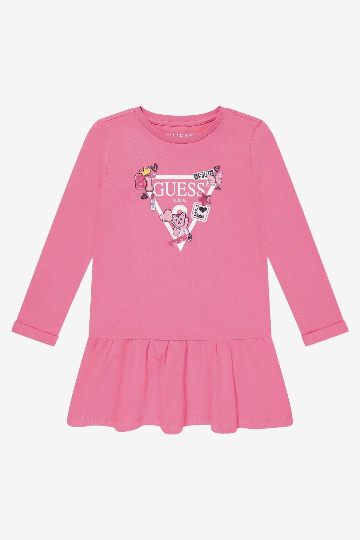 Playful, comfy, and full of sparkle – this hot pink GUESS® Kids dress is a little girl's dream come true. Made from soft, stretchy jersey cotton, it features the signature GUESS® logo surrounded by glittery teddy and heart prints for a fun, girly touch. The drop-waist skirt adds a sweet silhouette that’s perfect for twirling, while popper fastenings to the back of the neck make dressing easy for baby sizes. The smallest sizes (9–24 months) come with matching bloomers to complete the look.