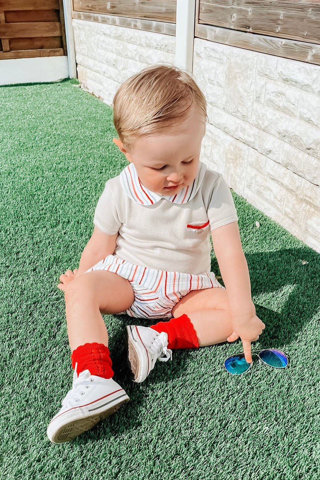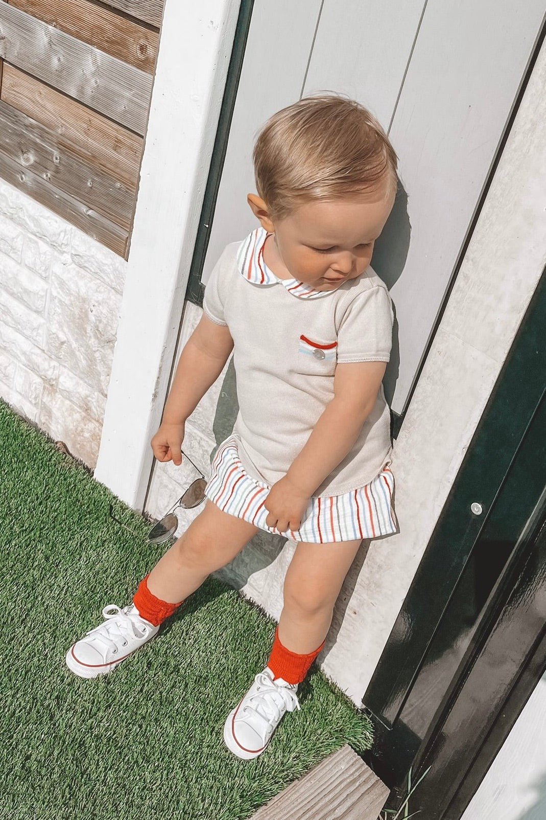 Boy's outfit set from Spanish designer Artesanía Granlei. Soft, lightweight stone short sleeve knitted top with red, blue and green striped cheesecloth collar and jam pants. Finished with a luxurious natural mother of pearl branded disc to the pocket.