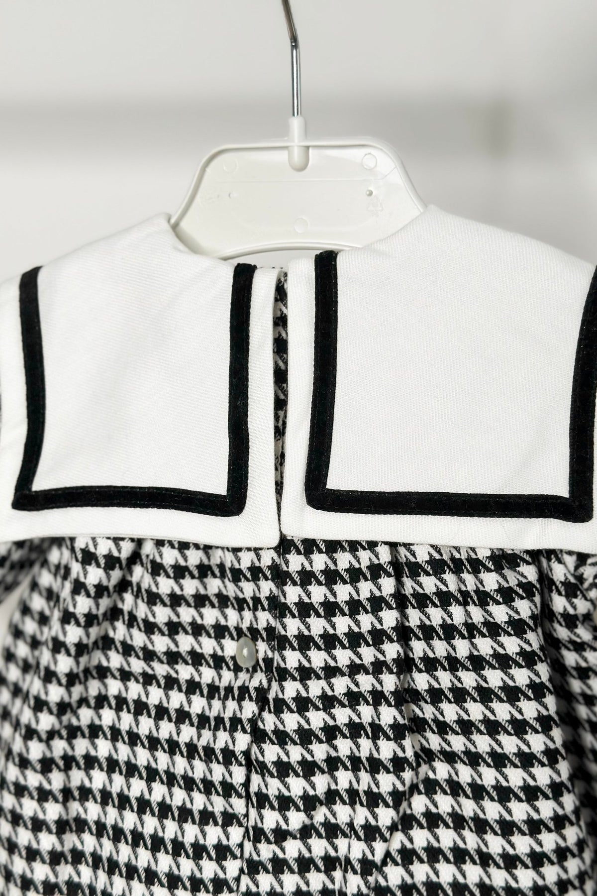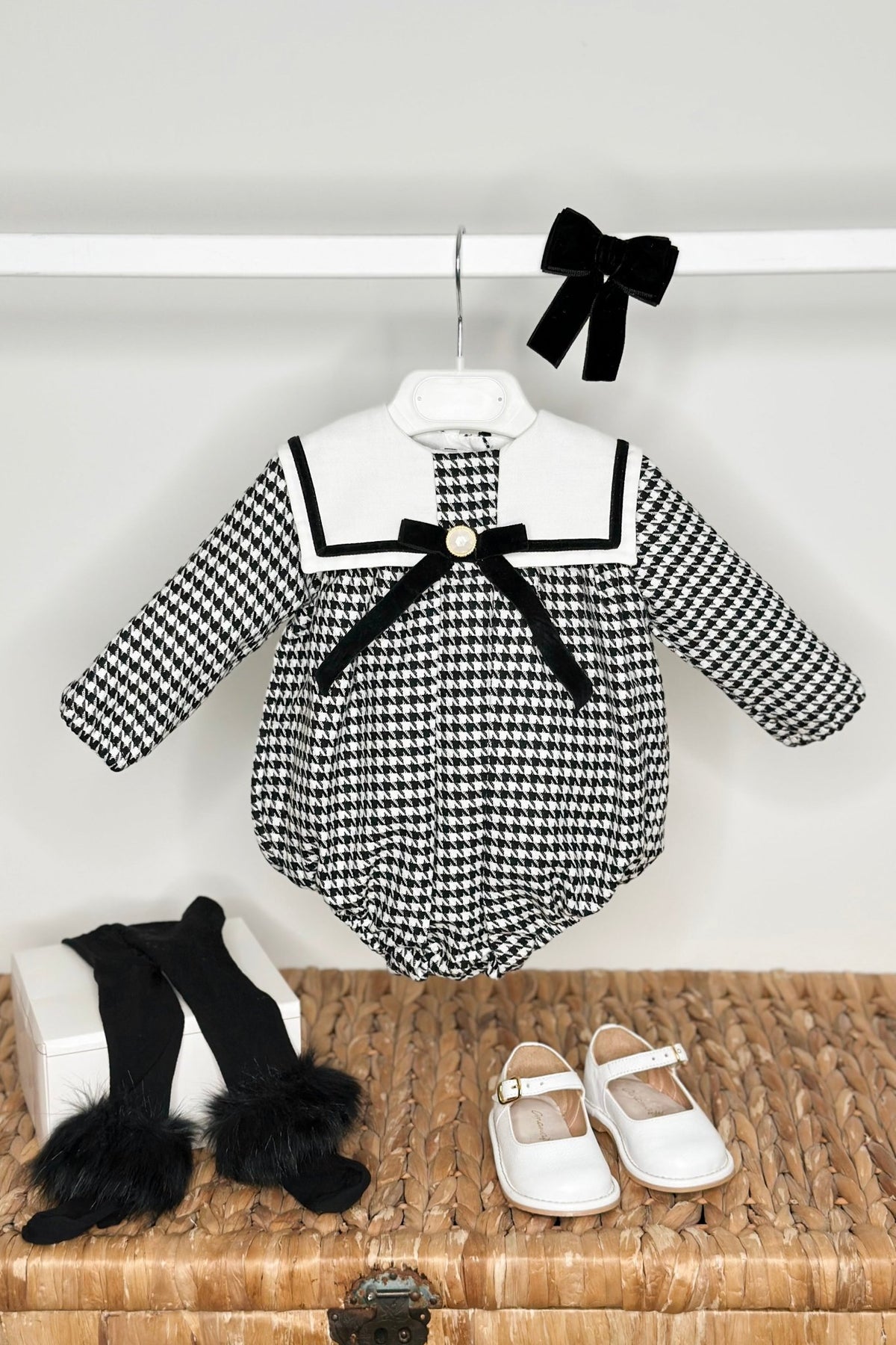 An elegant twist on a timeless classic – this baby girl’s romper from Fofettes x Be Chic is where sophistication meets softness. Crafted from lightweight woven houndstooth in black and white, it features a crisp white sailor-style collar framed with black velvet piping and finished with a velvet bow centred by a gold-tone faux-pearl button. Thoughtful mother-of-pearl button fastenings down the back and across the crutch make changes simple, while elasticated wrists and legs ensure a gentle, comfortable fit. Fully lined in soft cotton, it’s a beautiful choice for autumn days, special occasions, and every photo-worthy moment in between.