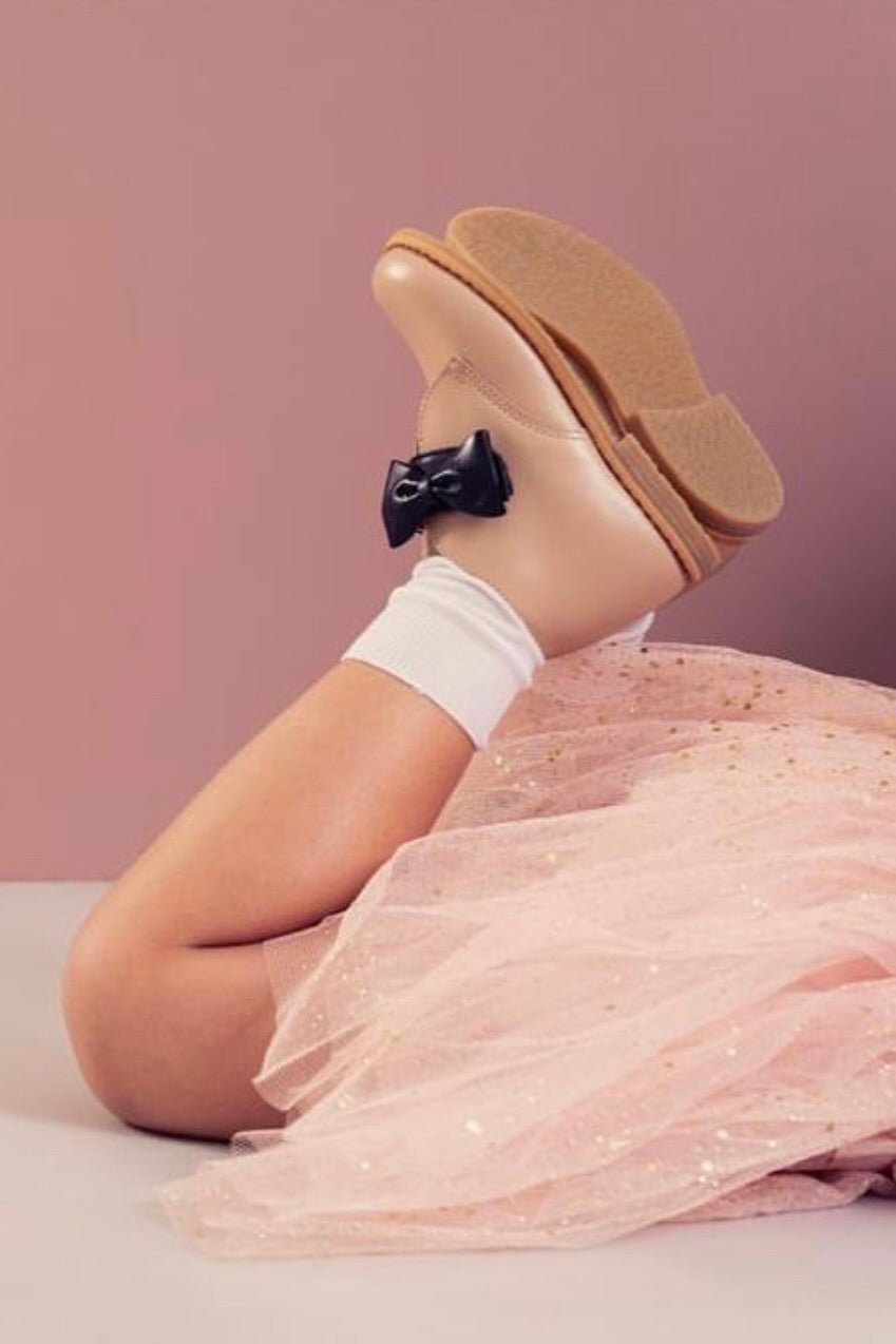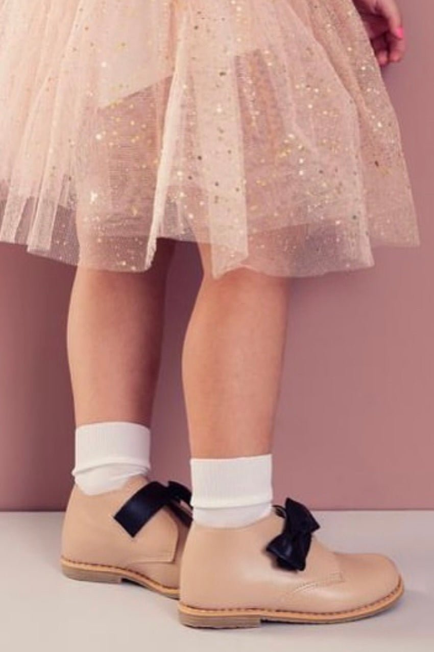 Ethically made girl's stone-coloured leather boots with black leather bow to strap from Brazilian brand Ananás Petit. With velcro fastening and a non slip natural rubber sole.