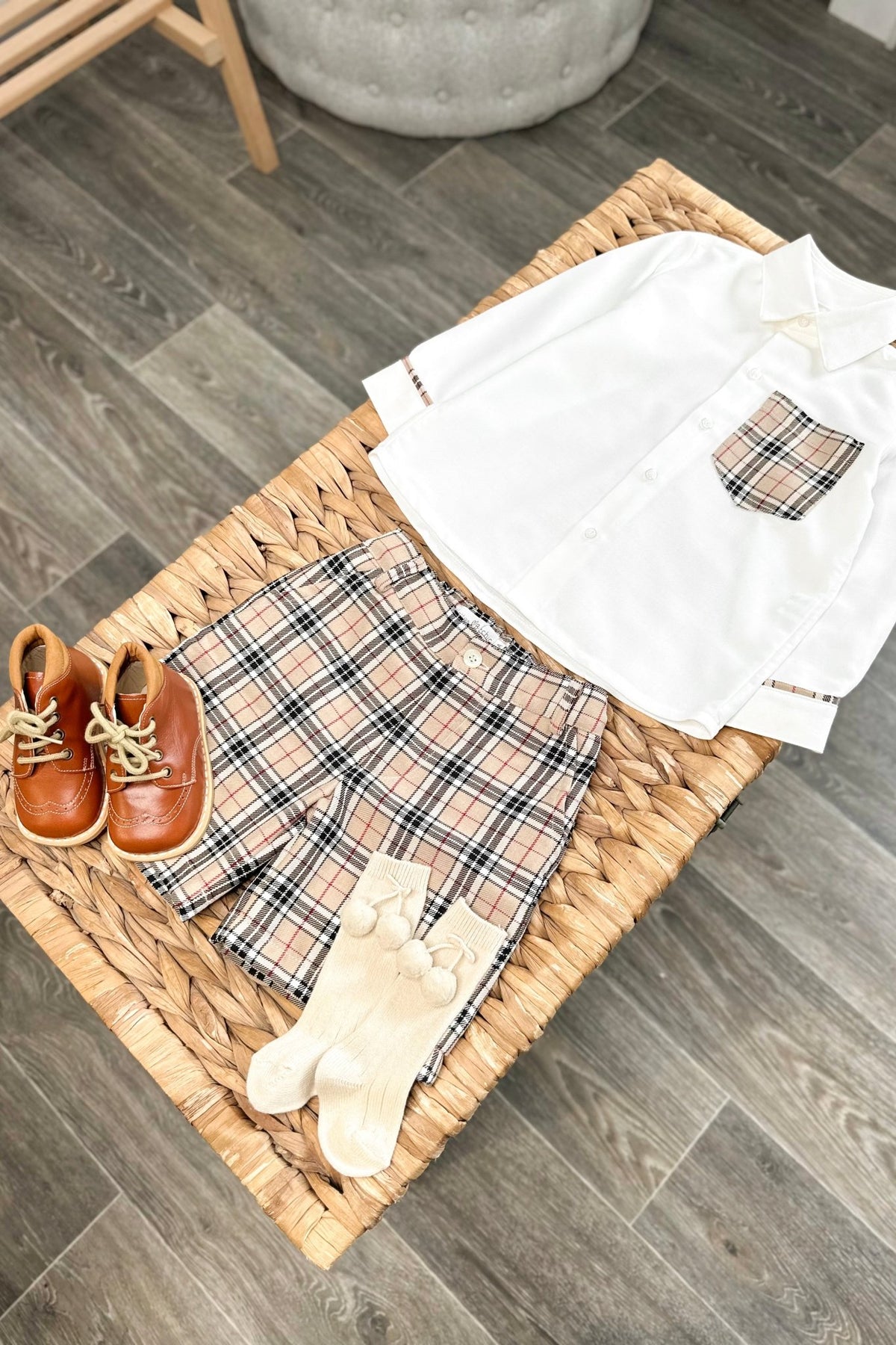 Effortlessly smart with a hint of heritage charm, this boys’ shirt and shorts set from Fofettes x Be Chic brings classic style into everyday wear. The crisp white cotton shirt features a tartan-trimmed pocket and cuffs – a subtle nod to traditional tailoring – while the matching beige tartan shorts add warmth and texture to the look. Softly lined and cut with a straight leg, the shorts feature an adjustable waistband for growing little ones, ensuring comfort and longevity. Perfect for autumn outings, family photos, or special occasions where a little polish goes a long way.