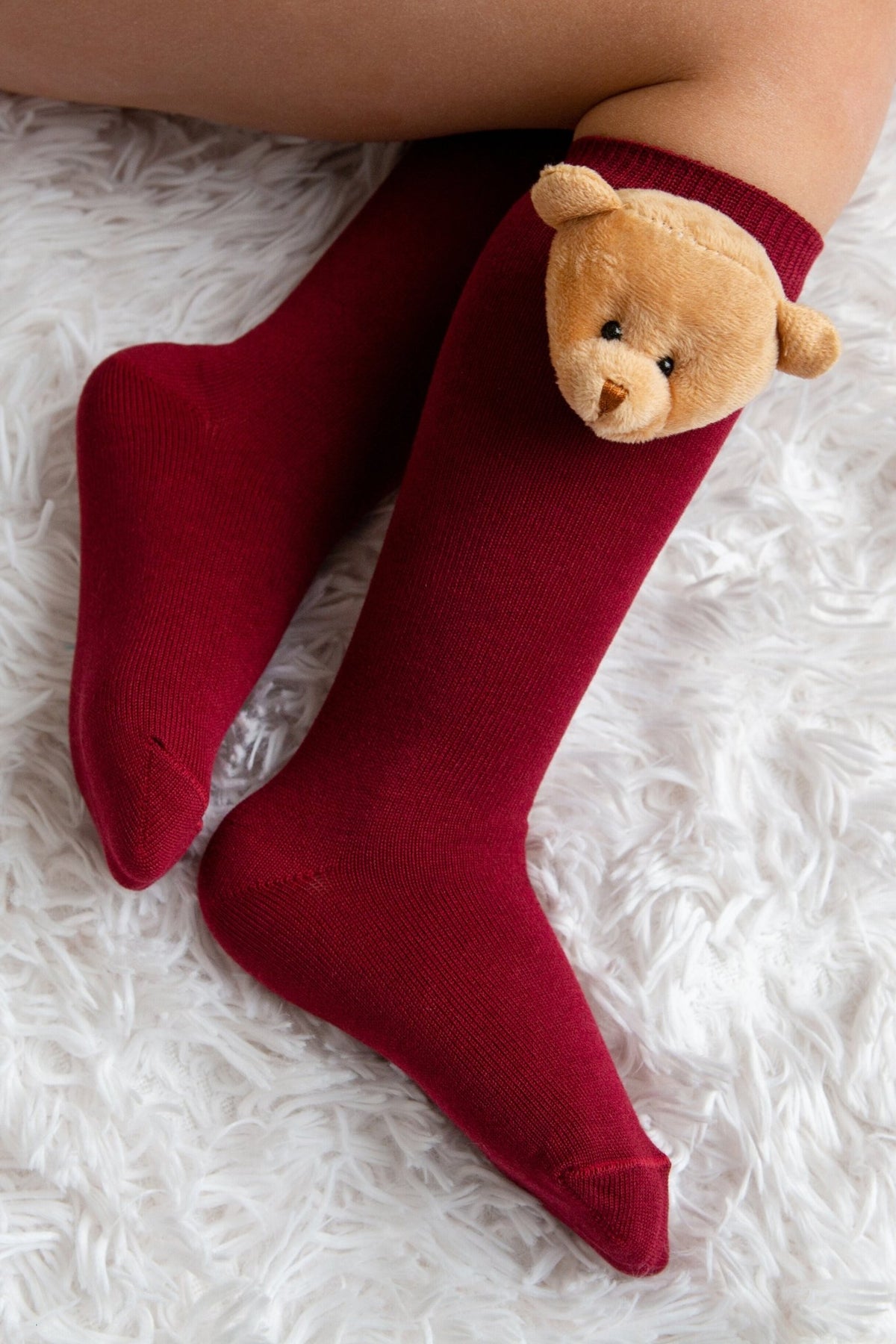 Unisex knee high socks with adorable 3D teddy head to the cuff from Portuguese brand Meia Pata. Choose from White, Black, Cream, Beige, Baby Blue, Navy Blue and Burgundy.