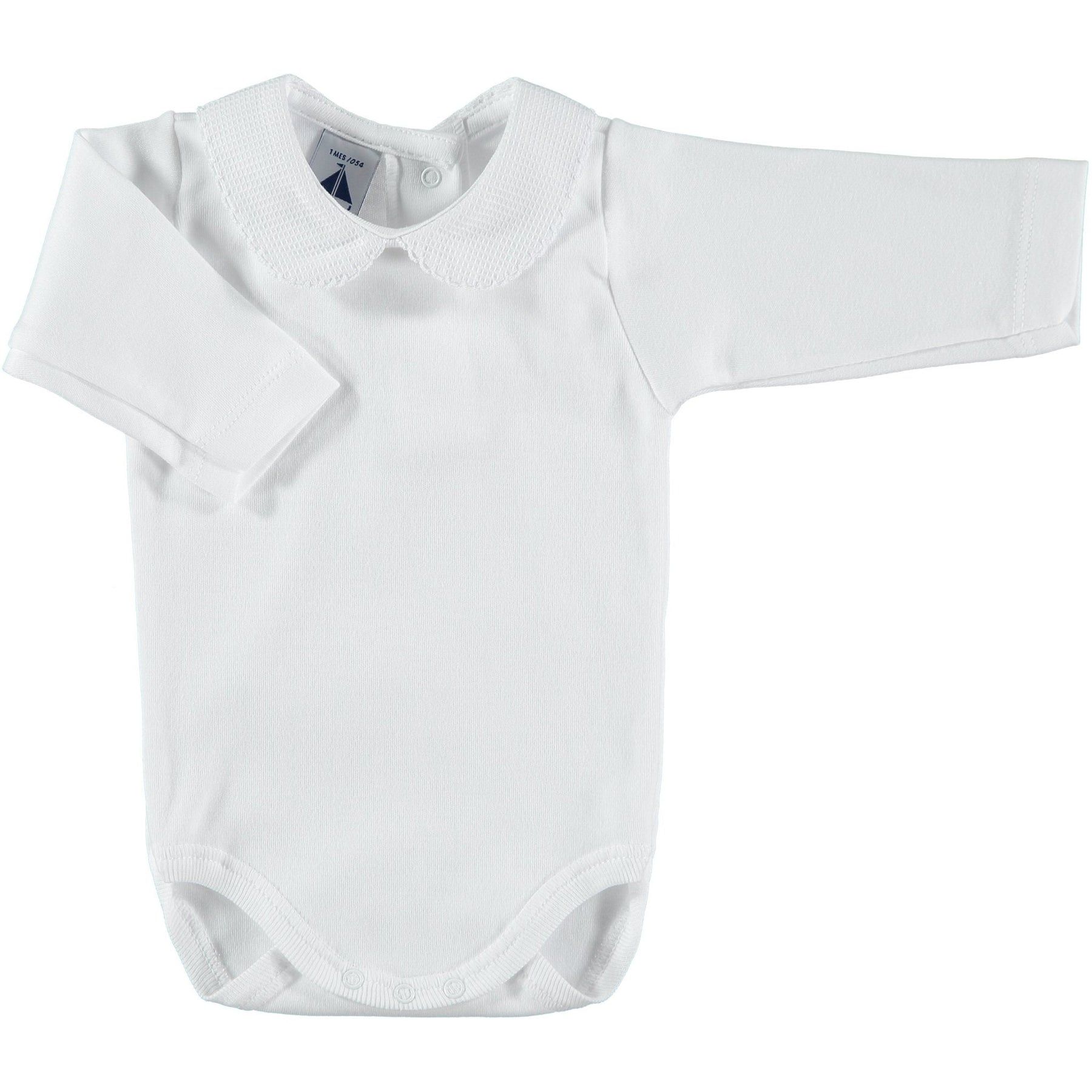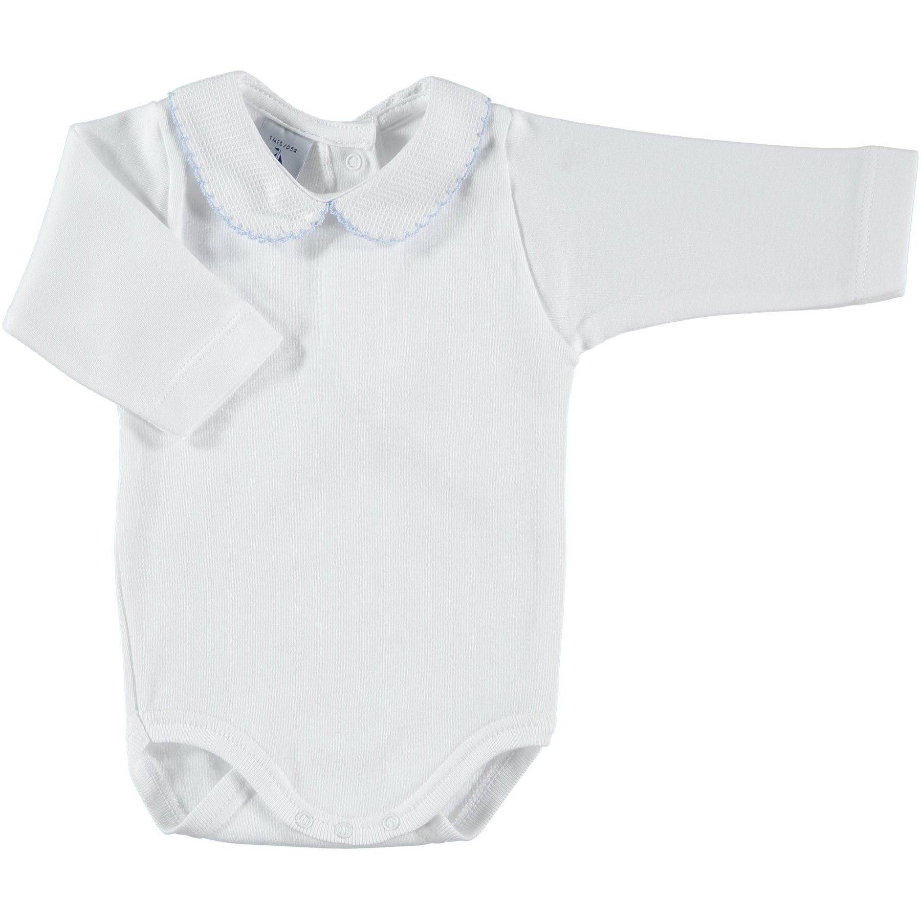 White Peter Pan collar bodysuit from Spanish brand Babidu . Soft, long-sleeve white cotton bodysuit with textured piqué Peter Pan collar with coloured trim - choose from blue, pink, grey, white, navy, beige, or burgundy trim. Fastens with poppers down the back and on the crutch for easy dressing and changing.