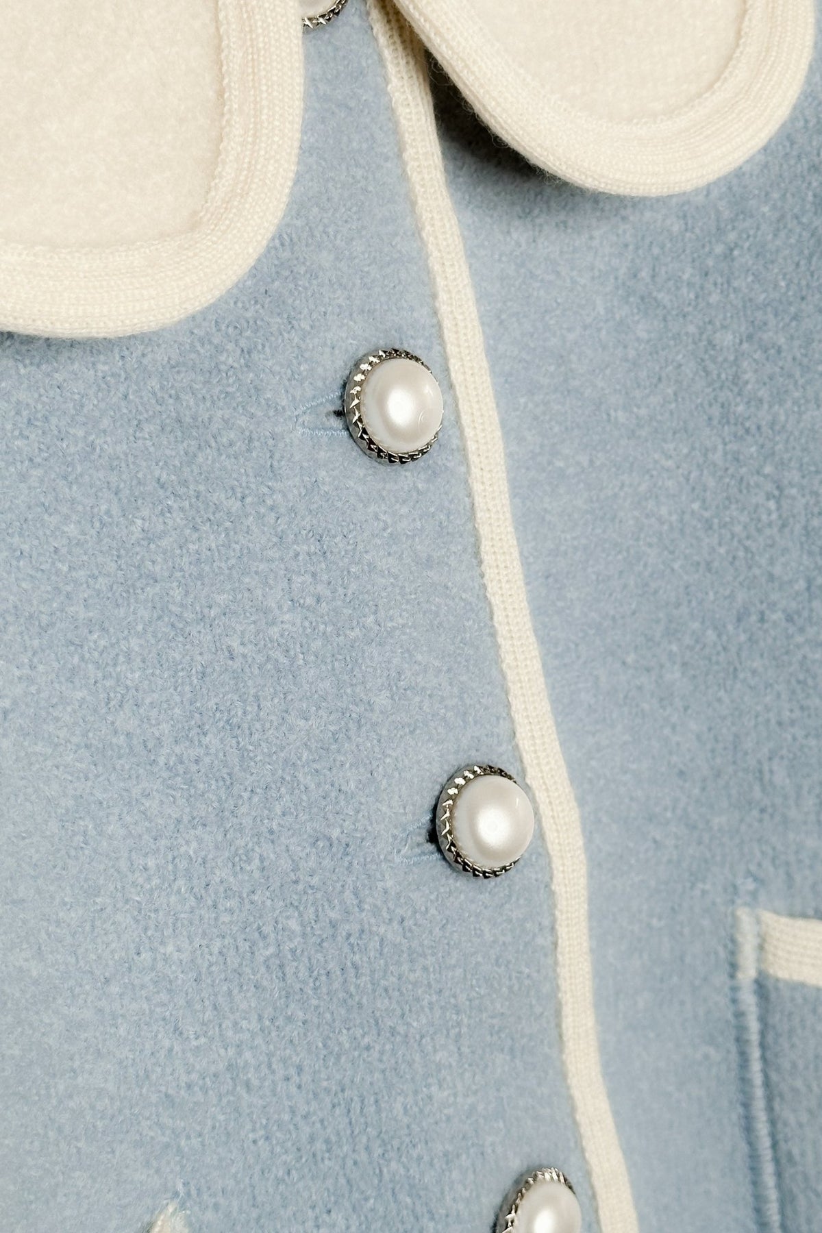 A coat to treasure for generations. Handcrafted in Spain from the finest Austrian merino wool, this MARAE Kids light blue coat is the epitome of timeless elegance. The petal-shaped collar and ivory trims bring a touch of heritage charm, while the faux pearl button fastening adds a delicate, refined finish. Designed to be generous in fit and made to last, it’s not just a coat – it’s an heirloom piece, ready to be loved now and passed down for years to come.