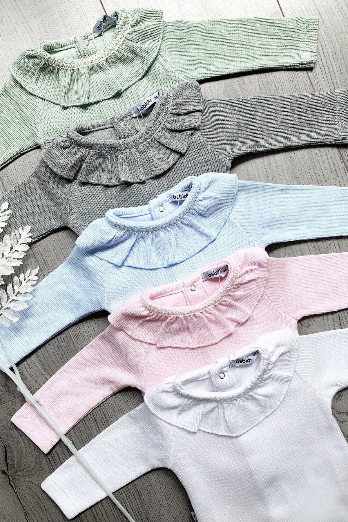 Adorable knit ruffle collar bodysuit from Spanish brand Babidu. Choose from White, Grey, Sage Green, Blue or Pink.