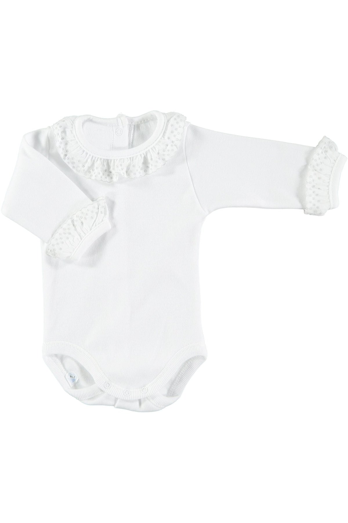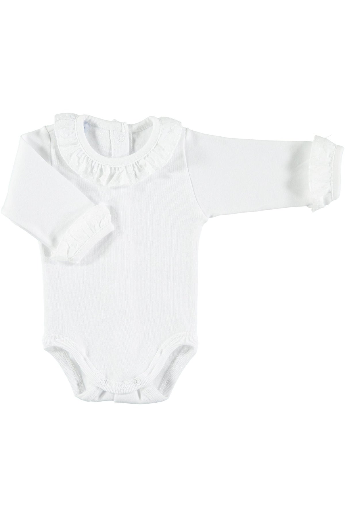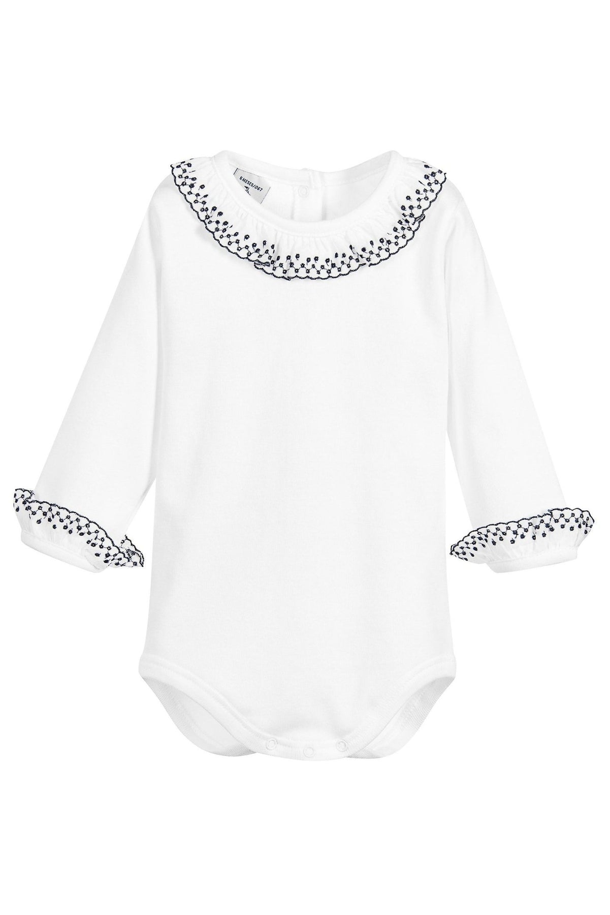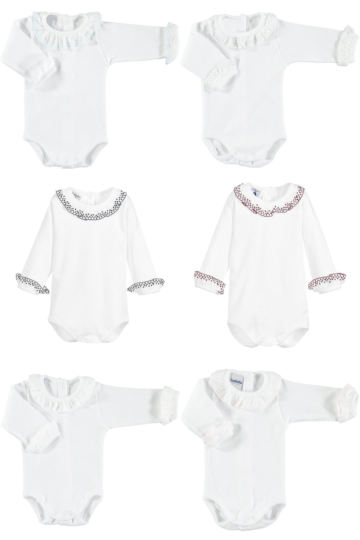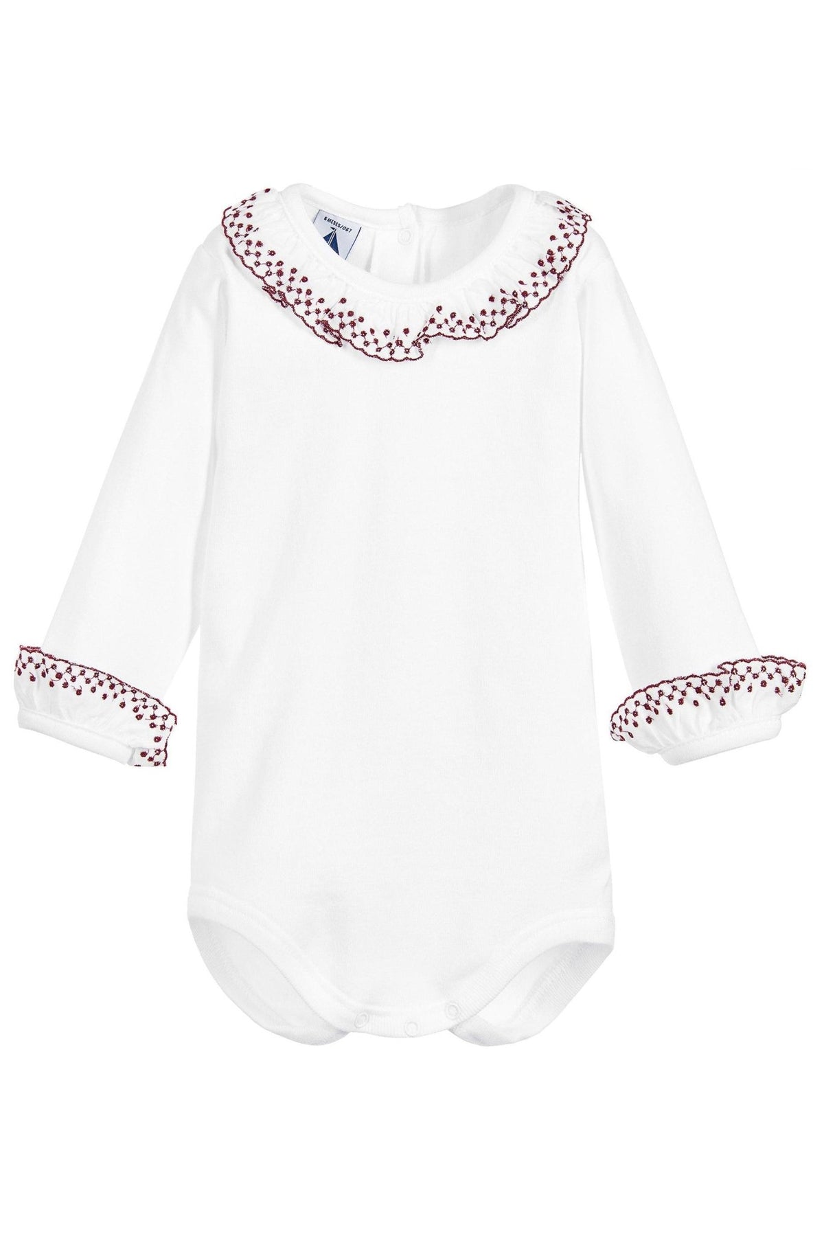 White ruffle collar bodysuit from Spanish brand Babidu. Soft, long-sleeve white cotton bodysuit with gorgeous ruffle collar with coloured embroidery - choose from pink, white, grey, navy or burgundy embroidery. Fastens with poppers down the back and on the crutch for easy dressing and changing.