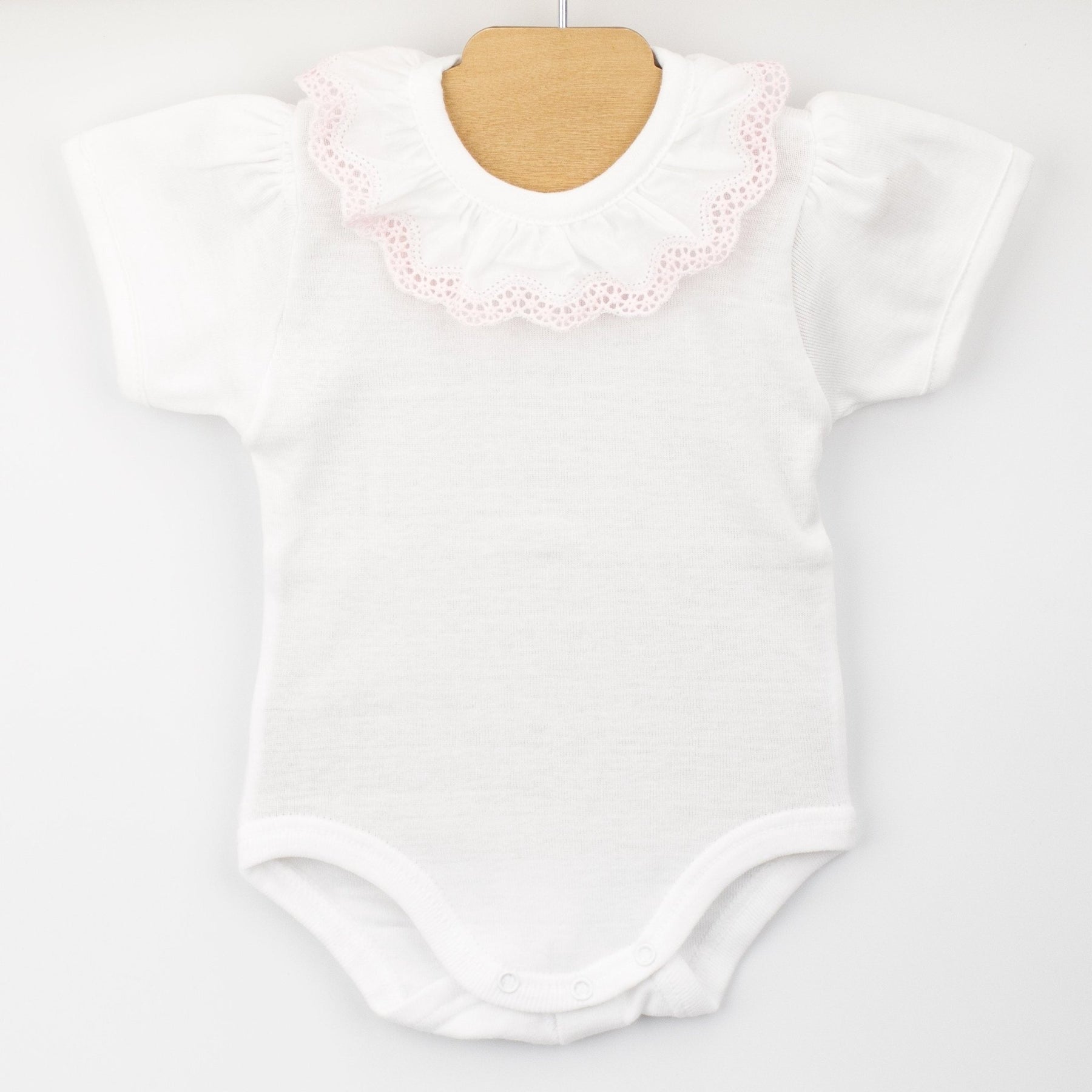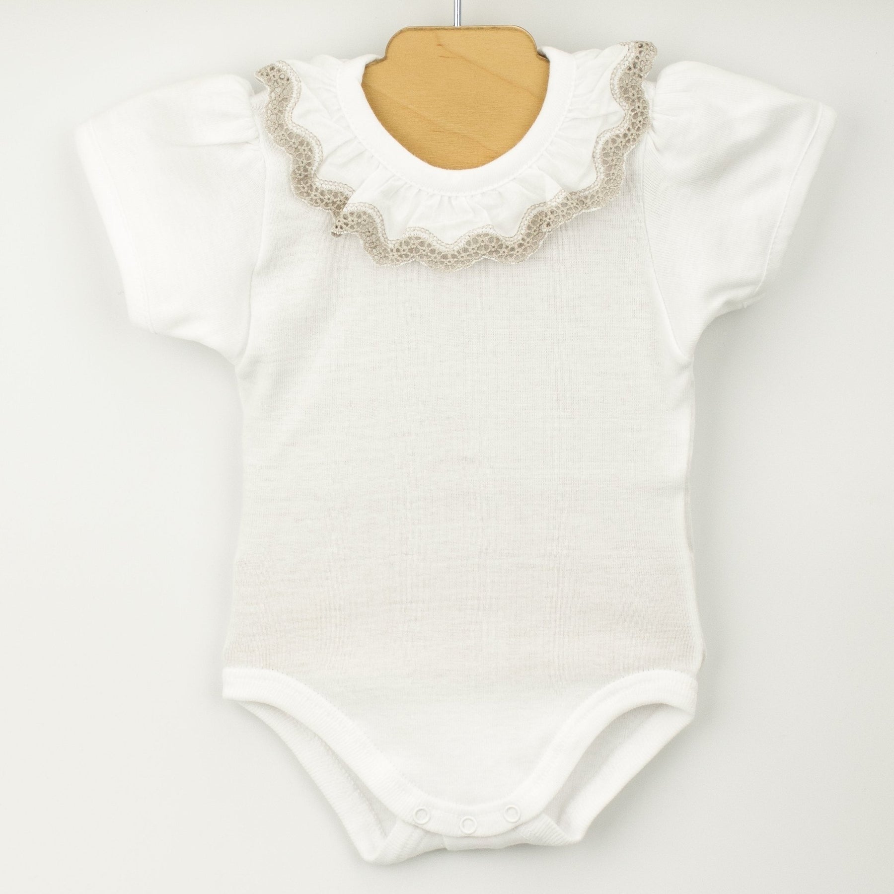 White ruffle collar bodysuit from Spanish brand Babidu. Soft, short-sleeve white cotton bodysuit with gorgeous ruffle collar with coloured lace trim - choose from blue, pink, grey or white lace. Fastens with poppers down the back and on the crutch for easy dressing and changing.