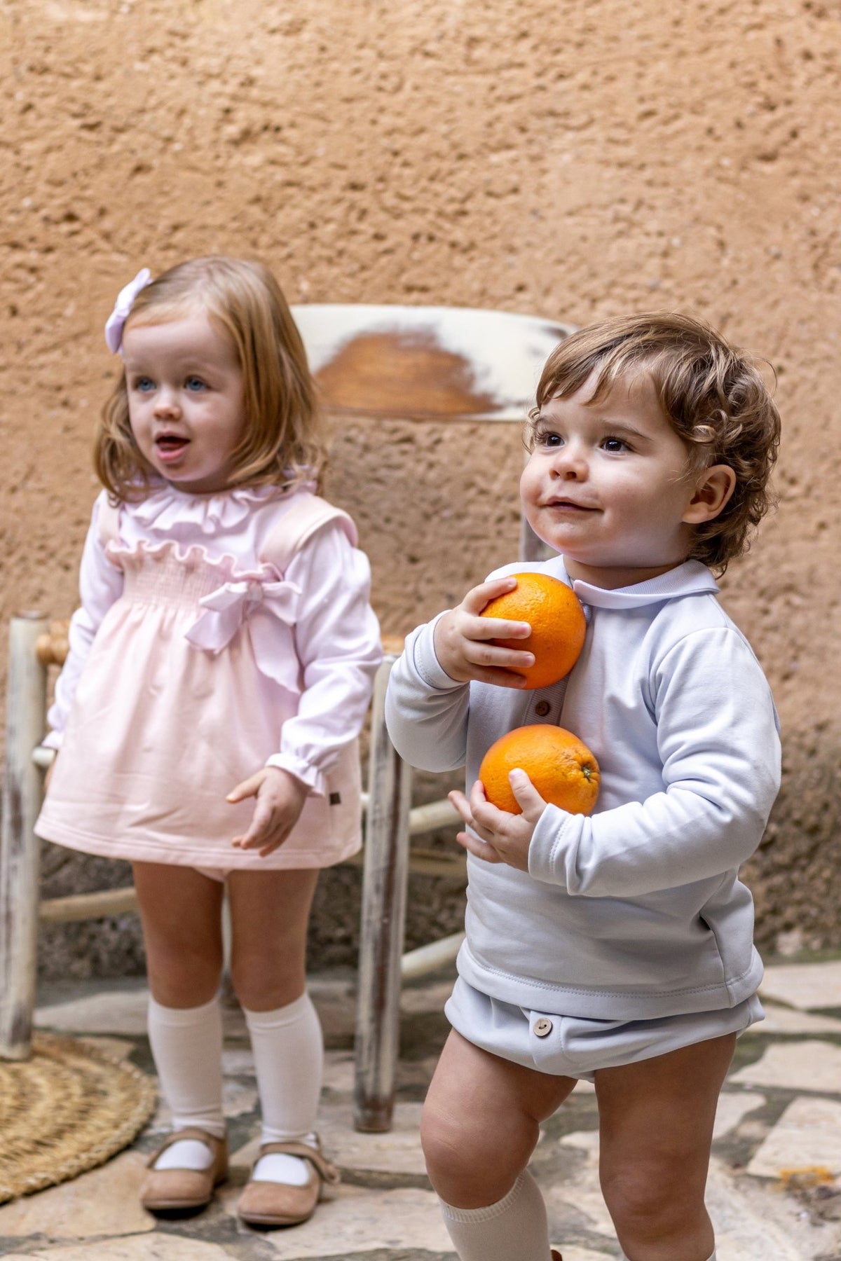 There’s something irresistibly nostalgic about a baby boy in soft jam pants – especially when they’re paired with a top as sweet as this. Made from thick, slightly stretchy jersey cotton and fully lined with a fleecy inner layer, this two-piece set from Calamaro is designed for comfort on chilly autumn and winter days. The long-sleeved top features a woven blue-and-white striped collar and matching placket with wooden-style buttons for a touch of classic charm, while the poppers down the back make dressing wriggly little ones fuss-free. The matching jam pants have a gently elasticated waist and legs for a cosy, snug fit that doesn’t compromise on cuteness.