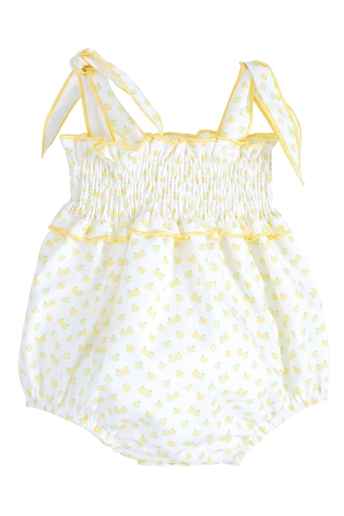 A sunshine-ready outfit for your little girl from Calamaro, this lemon and lime apple print shortie is as sweet as can be. Made from soft, super lightweight cotton, it features a beautifully shirred chest for a snug yet comfy fit and delicate straps that tie into dainty bows at the shoulders. Elasticated legs ensure all-day comfort, while button fastenings at the crotch make changing quick and easy. Fully lined for extra softness and presented in a branded Calamaro box—perfect for gifting!