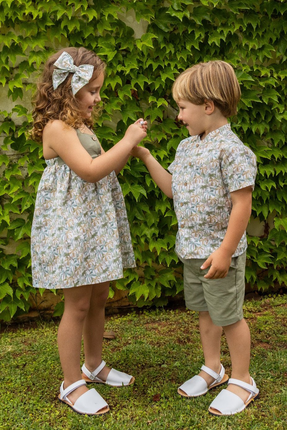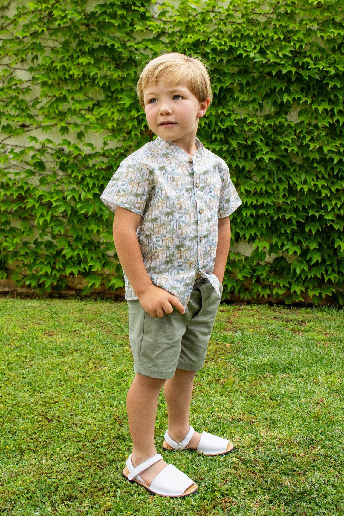 A timeless summer set for boys from Calamaro, designed with both comfort and style in mind. The lightweight, short-sleeved shirt features a charming olive green palm tree print, perfect for warm-weather adventures. It fastens neatly with coconut buttons down the front for a polished finish. The coordinating bottoms vary by size—adorable jam pants with an elasticated waist and legs for babies, while older boys can enjoy classic tailored shorts with a single coconut button fastening. Whether for a family outing or a special occasion, this versatile set offers a fresh, breezy look.