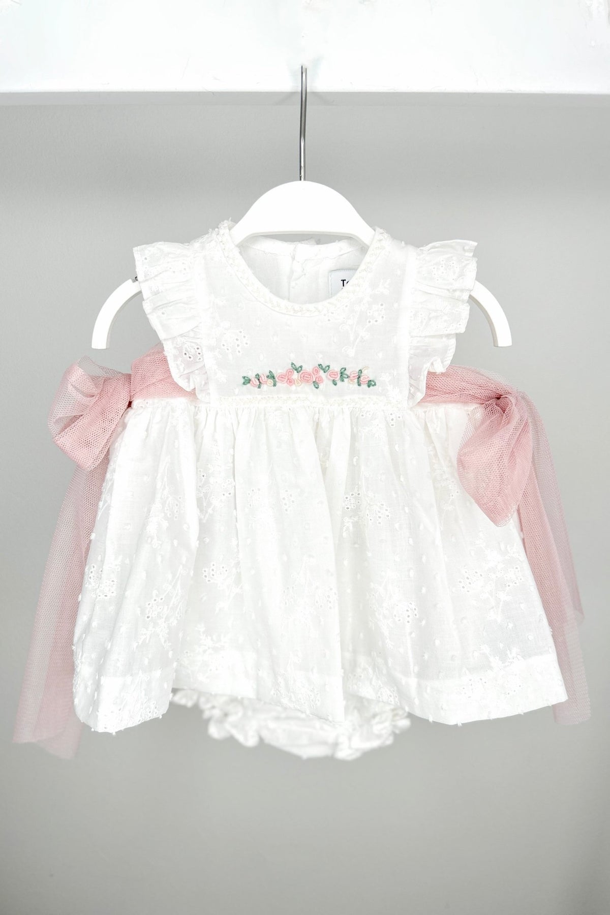 Baby girl's embroidered dress set from Spanish brand Tartaleta. Lightweight ivory plumeti dot dress adorned with stunning embroidered floral pattern, featuring pretty cap sleeves, intricate hand embroidered flowers across the chest and a large dusky pink tulle bow to each side of the waist. Outfit is completed with matching ivory bloomers.