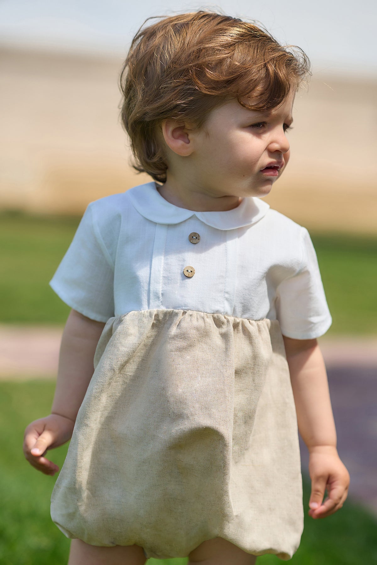 This charming romper from Rapife features an ivory upper and beige body, made from a lightweight, woven cotton-linen blend. The romper is short-sleeved with a classic collar and is designed for comfort with elasticated legs and popper fastening to the back and crutch for easy dressing. Ideal for warmer weather, this romper combines style with practicality.