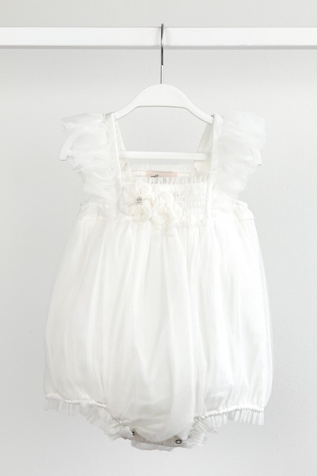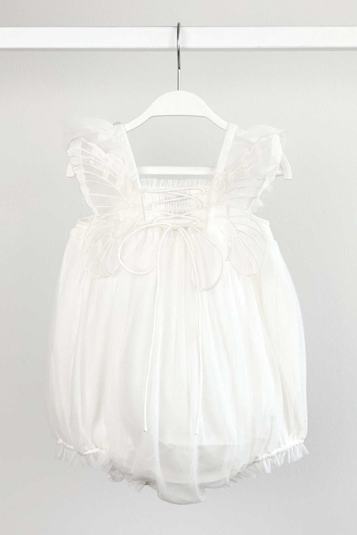 Stunning tulle romper from American designer Luna Luna Collection. White tulle romper with ruched bodice adorned with tulle flower decorated with silver beading and sequins. Romper has pretty lace up back, and is finished with ethereal fairy wings. The perfect outfit for any special occasion.