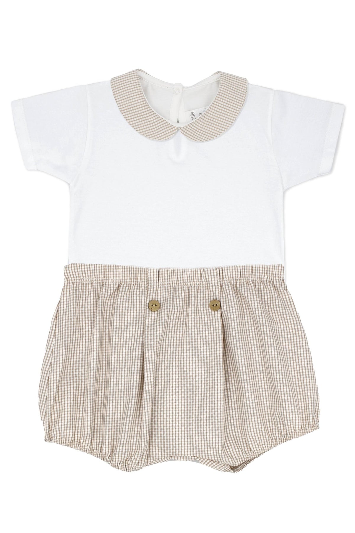 Baby boy's outfit set from Spanish brand Rapife's Spring/Summer '24 collection. Lightweight white short sleeve collared bodysuit, paired with beige and white checked jam pants. Perfect for special occasions or sunny days at the park.