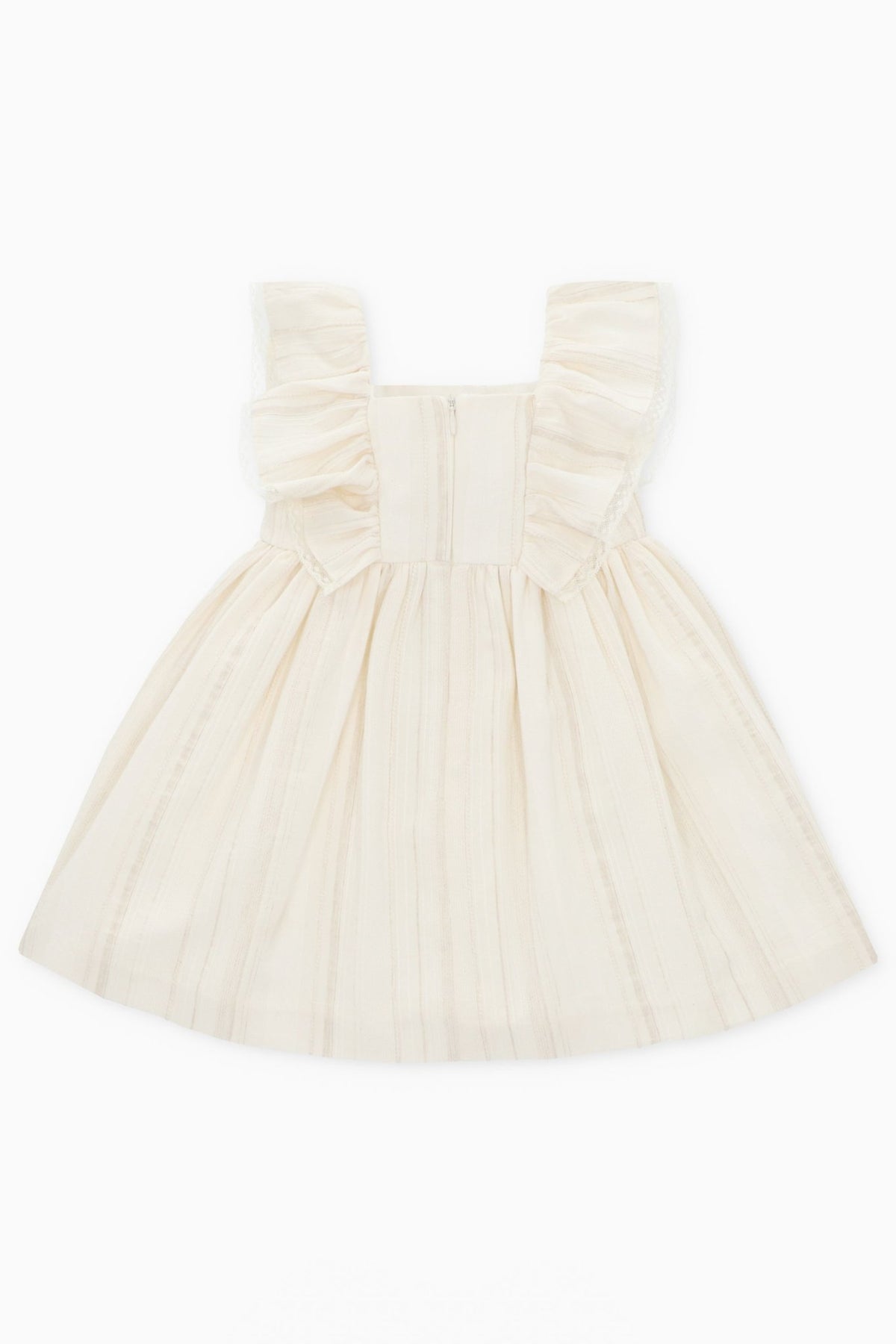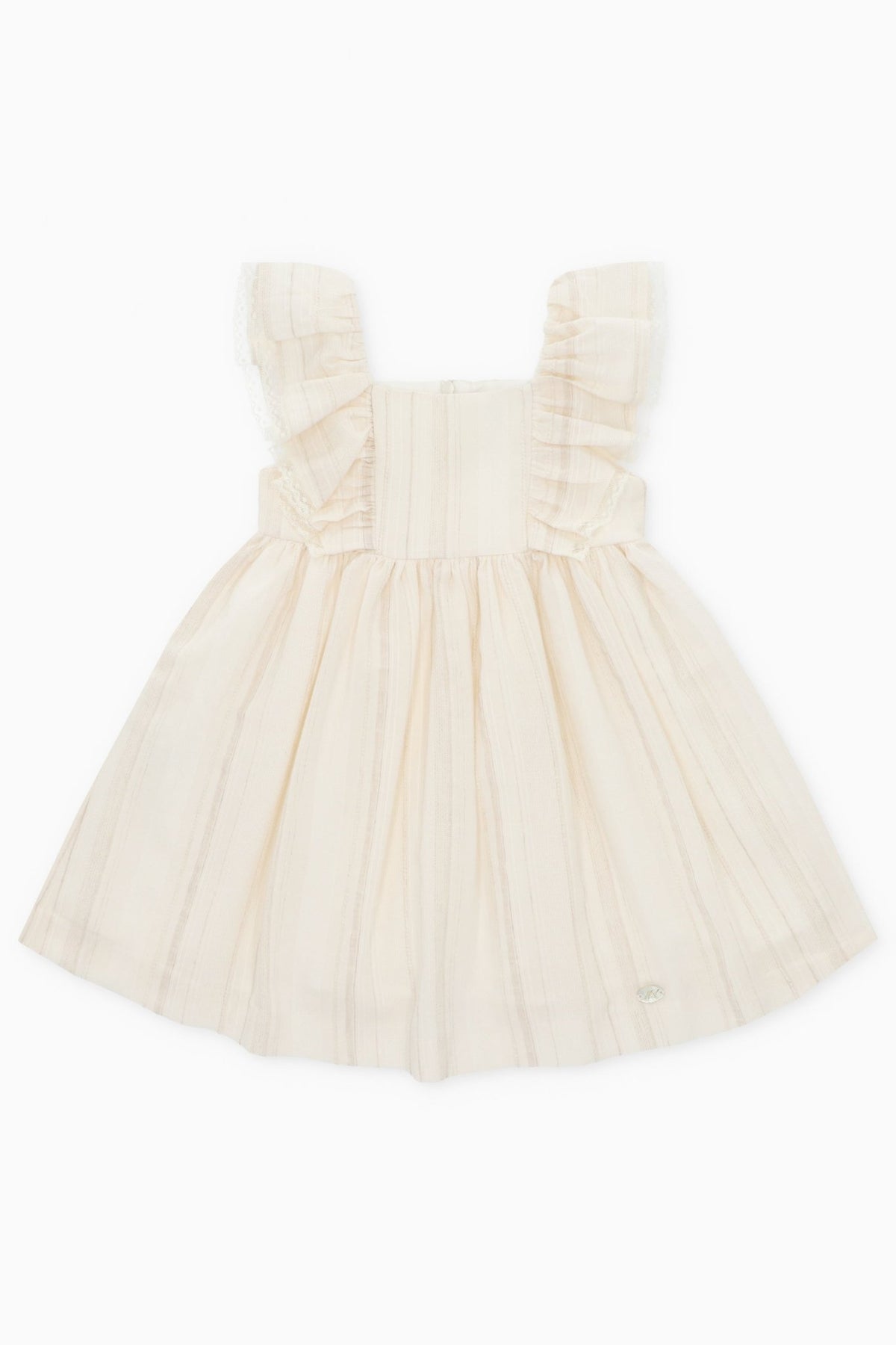 Girl's classic dress from Martín Aranda. Whimsical and light, this cream-coloured dress for little ones features textured stripes and charming large ruffle sleeves trimmed with lace. Ready for your little one's christening, with a hidden zipper in the back for effortless dressing.