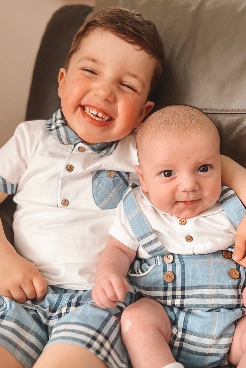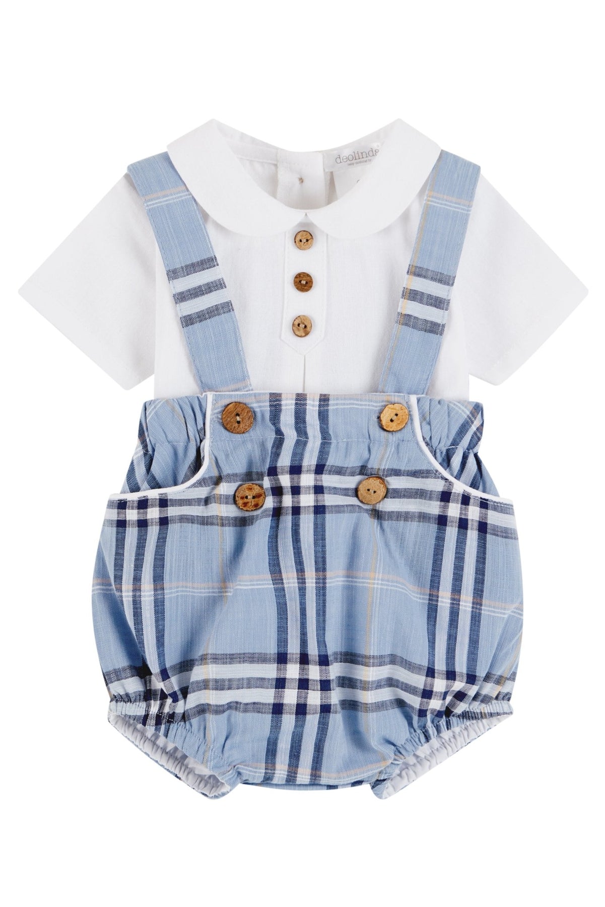 Baby boy's blue tartan outfit set from Portuguese brand Deolinda. Super lightweight white short sleeve shirt underneath dusky blue tartan jam pants with braces, finished with coconut button decoration.