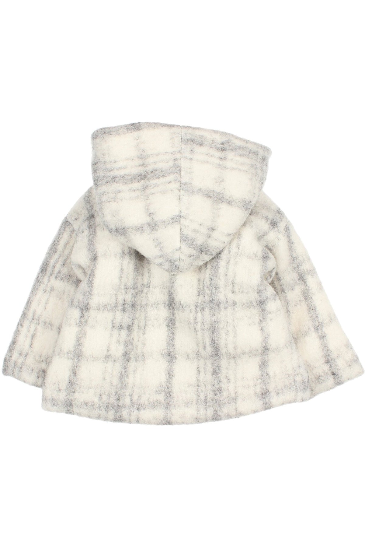 Unisex baby jacket from Spanish brand Búho. Super thick light grey checked wool hooded coat with super soft ivory sherpa lining.