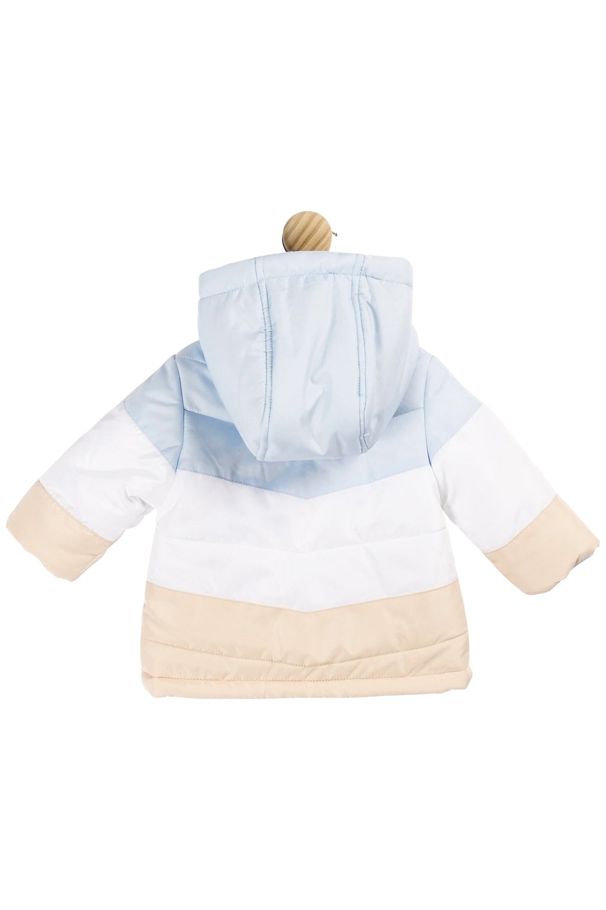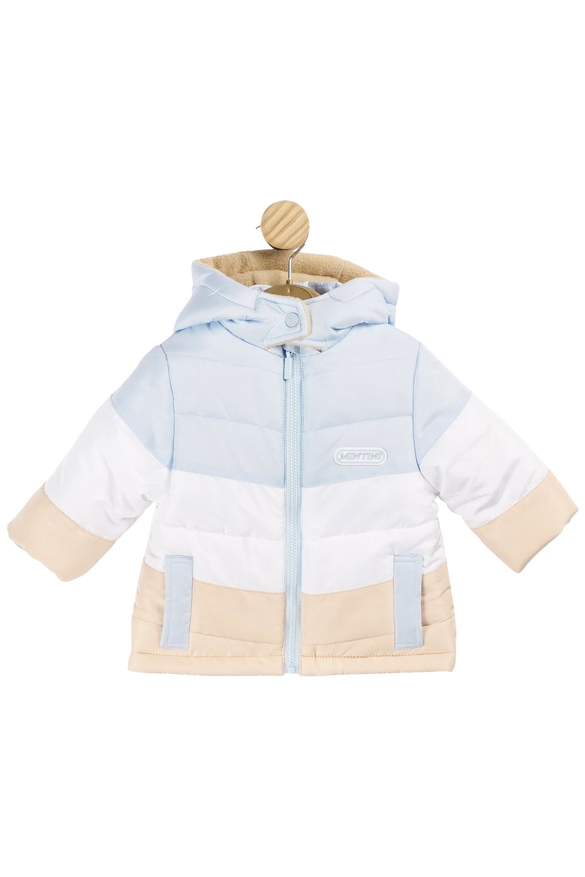 Boy's colour block jacket from British brand Mintini Baby. Soft, thick baby blue, white and beige colour block hooded puffer jacket with soft and snuggly beige sherpa lining.