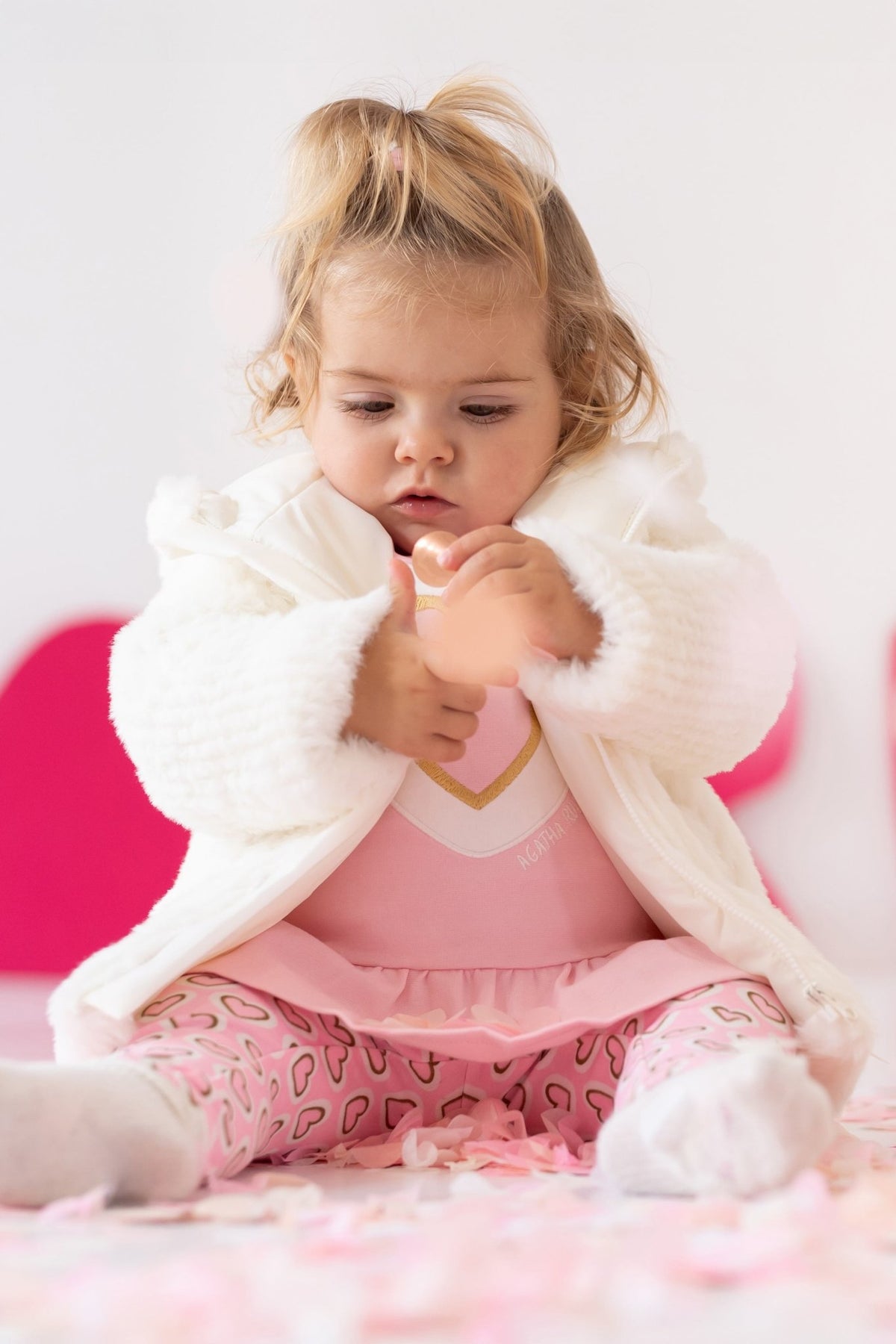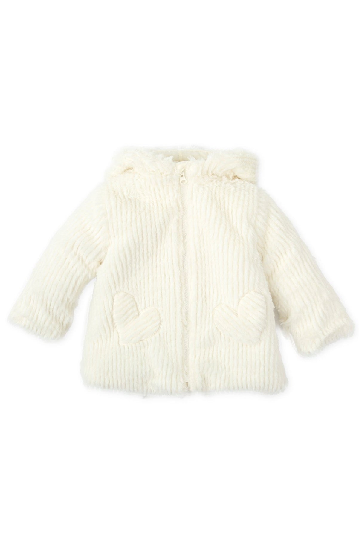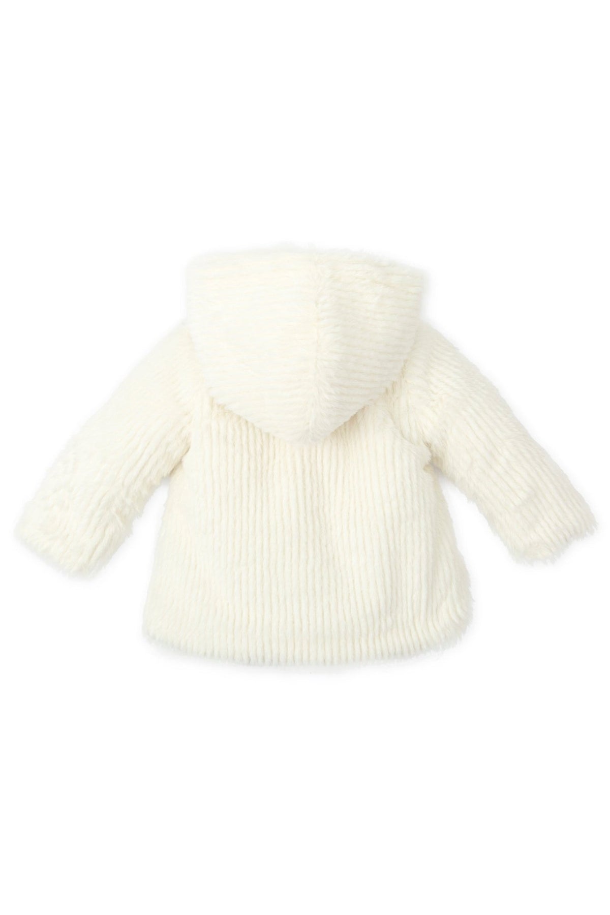 Girl's jacket from Spanish brand Agatha Ruíz de la Prada. Super soft ivory faux fur hooded jacket with cute heart shaped pockets. Zip fastening. Lightly padded.