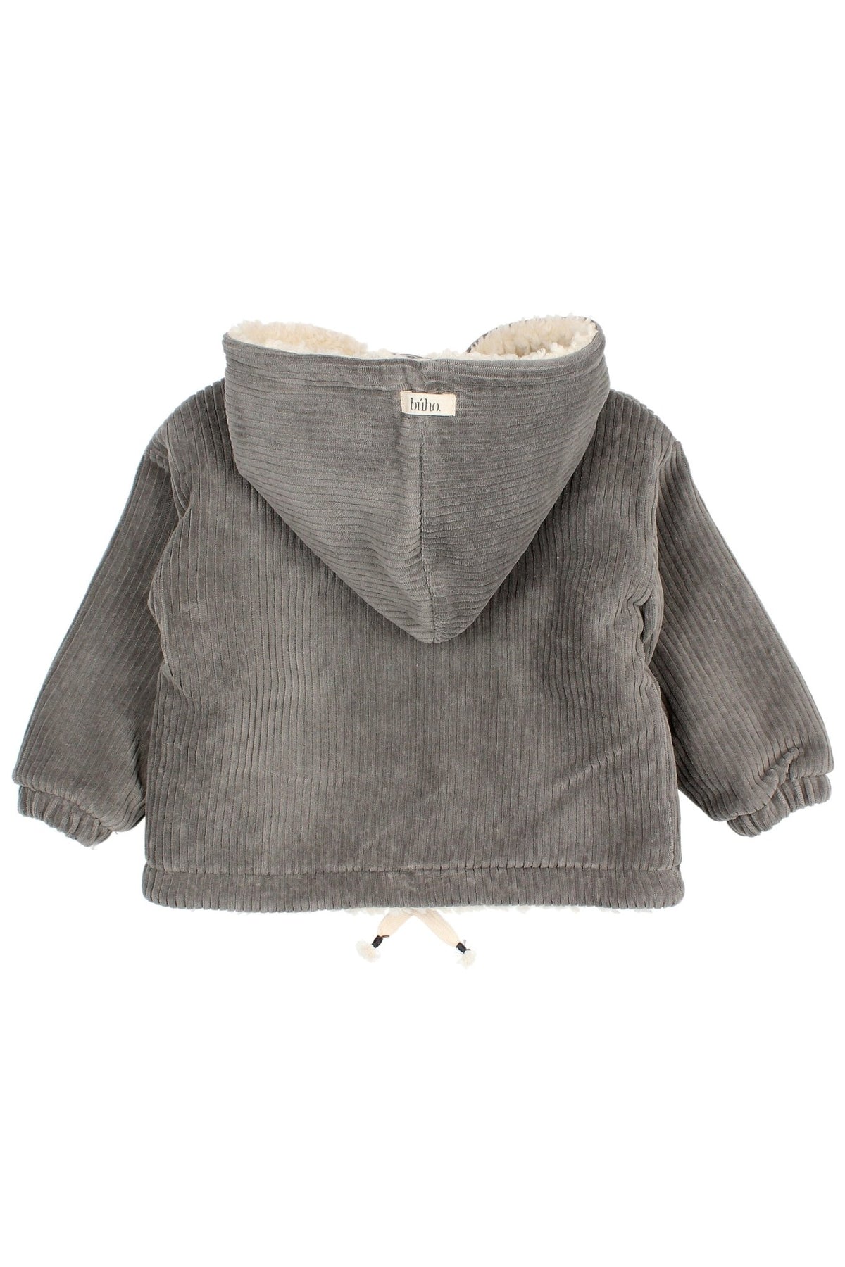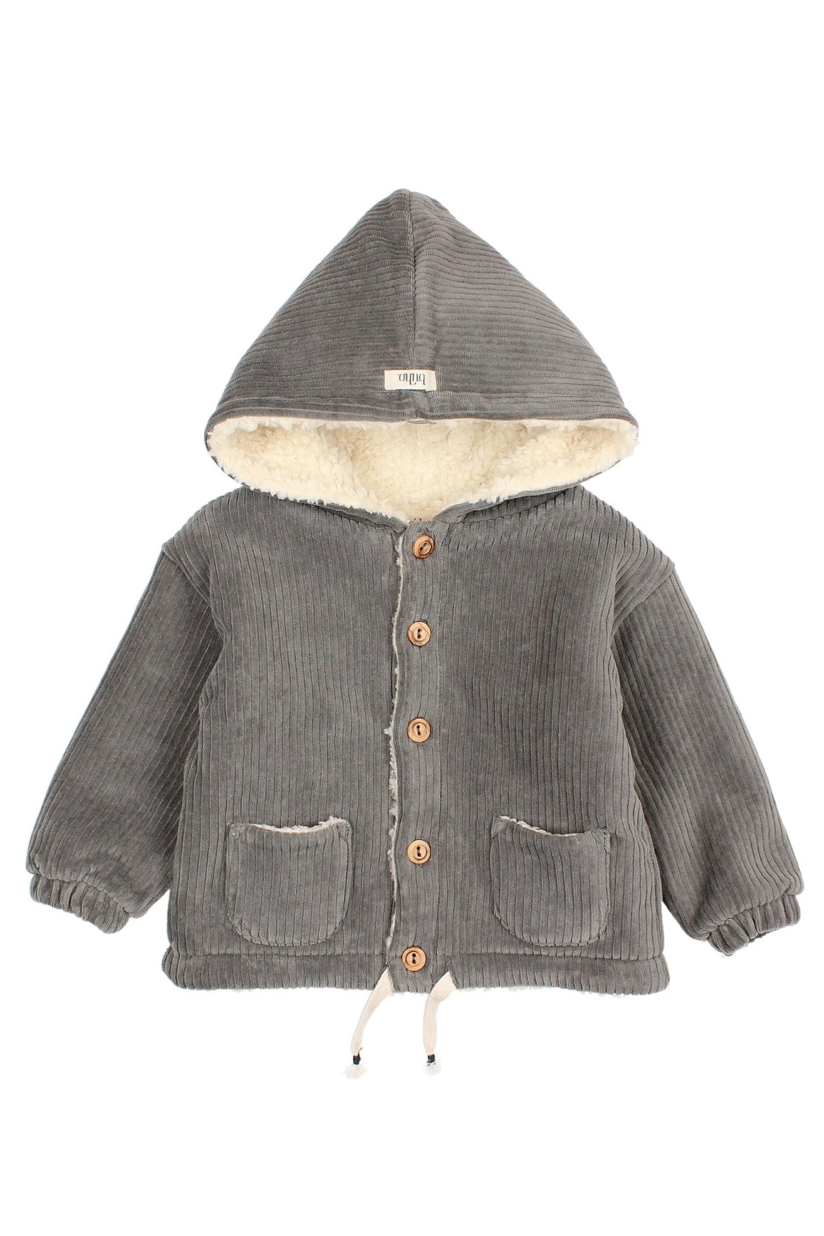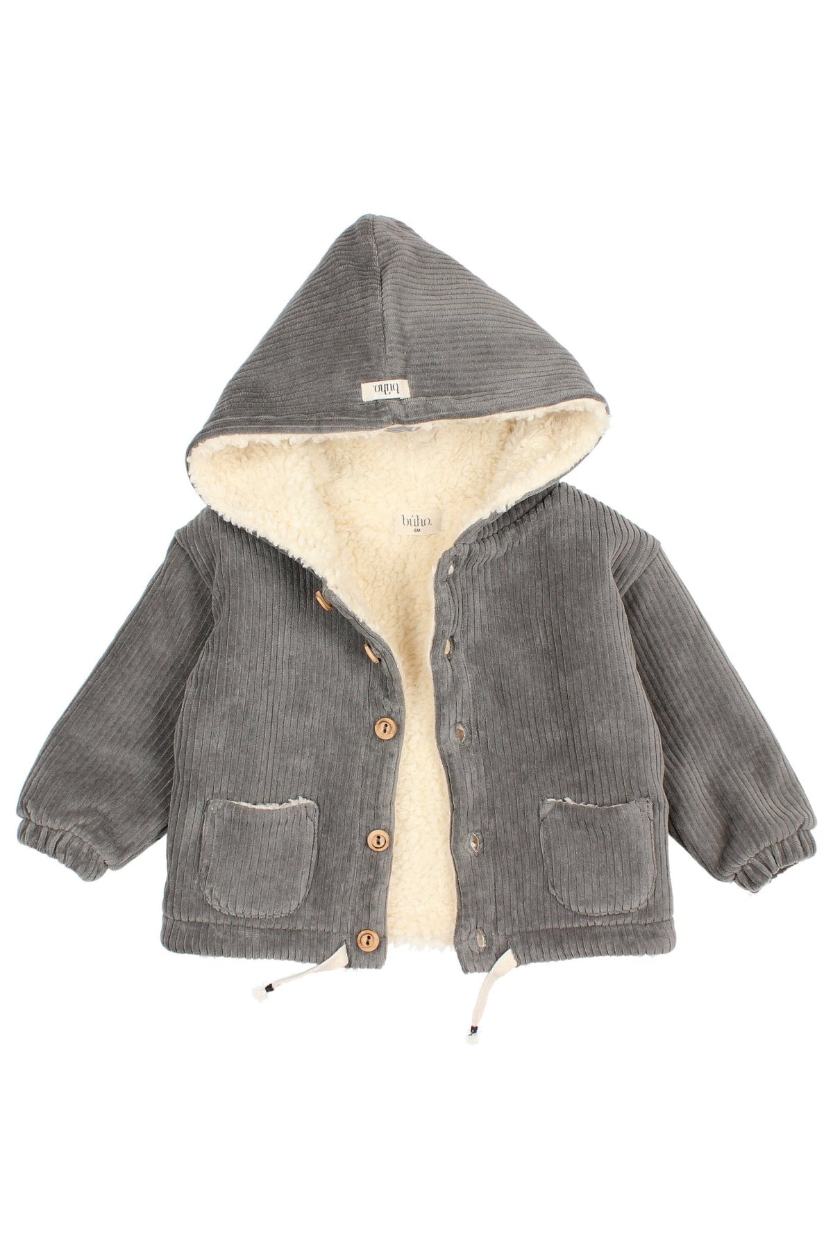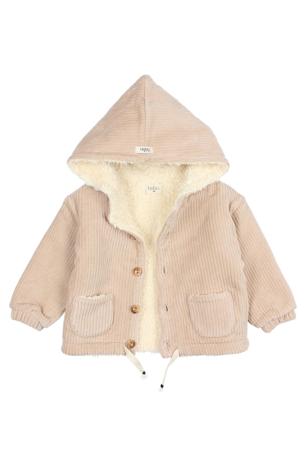 Unisex baby jacket from Spanish brand Búho. Super soft, thick corduroy hooded jacket with snuggly sherpa lining and drawstring around the waist.