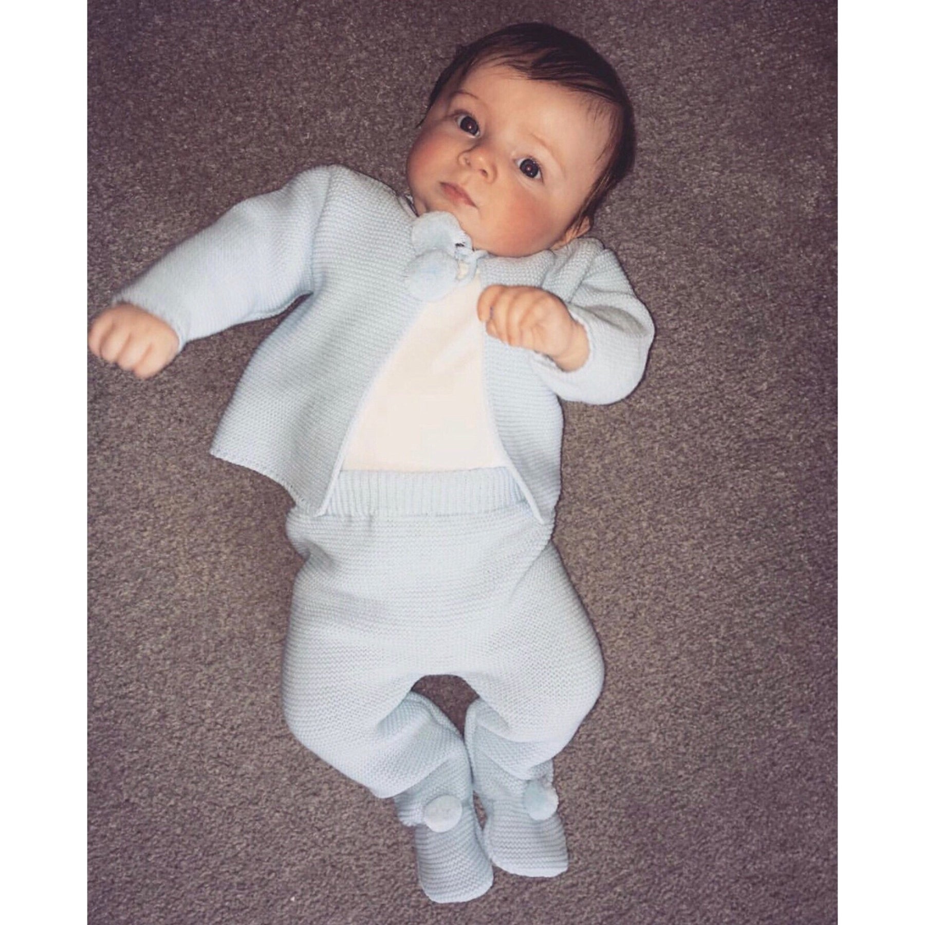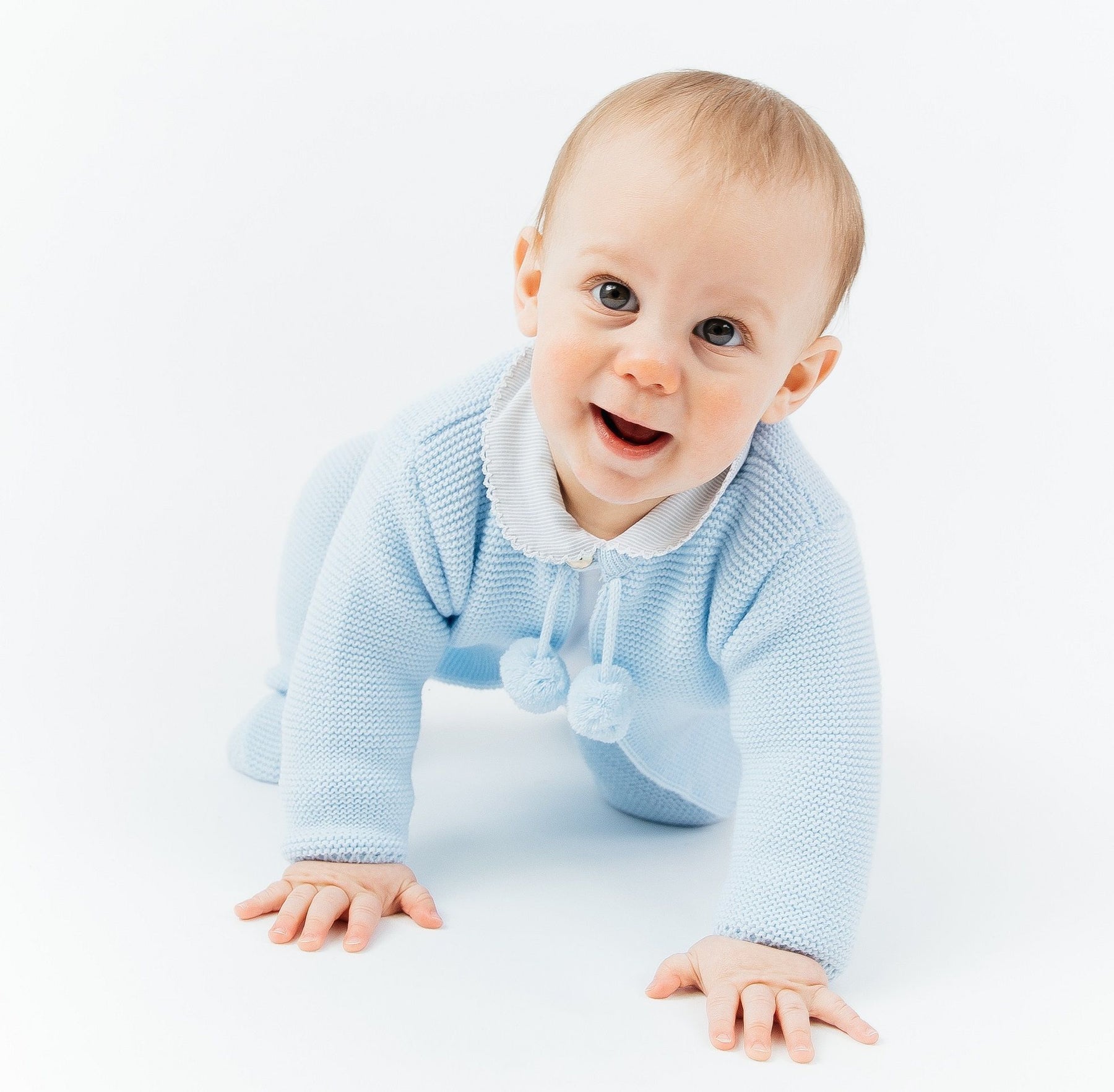 Does it get any more adorable than this? Keep your little one feeling cosy and looking cute in this gorgeous sky blue knitted two piece set from Dandelion. Set includes blue knitted cardigan with pom poms and matching blue knitted leggings.