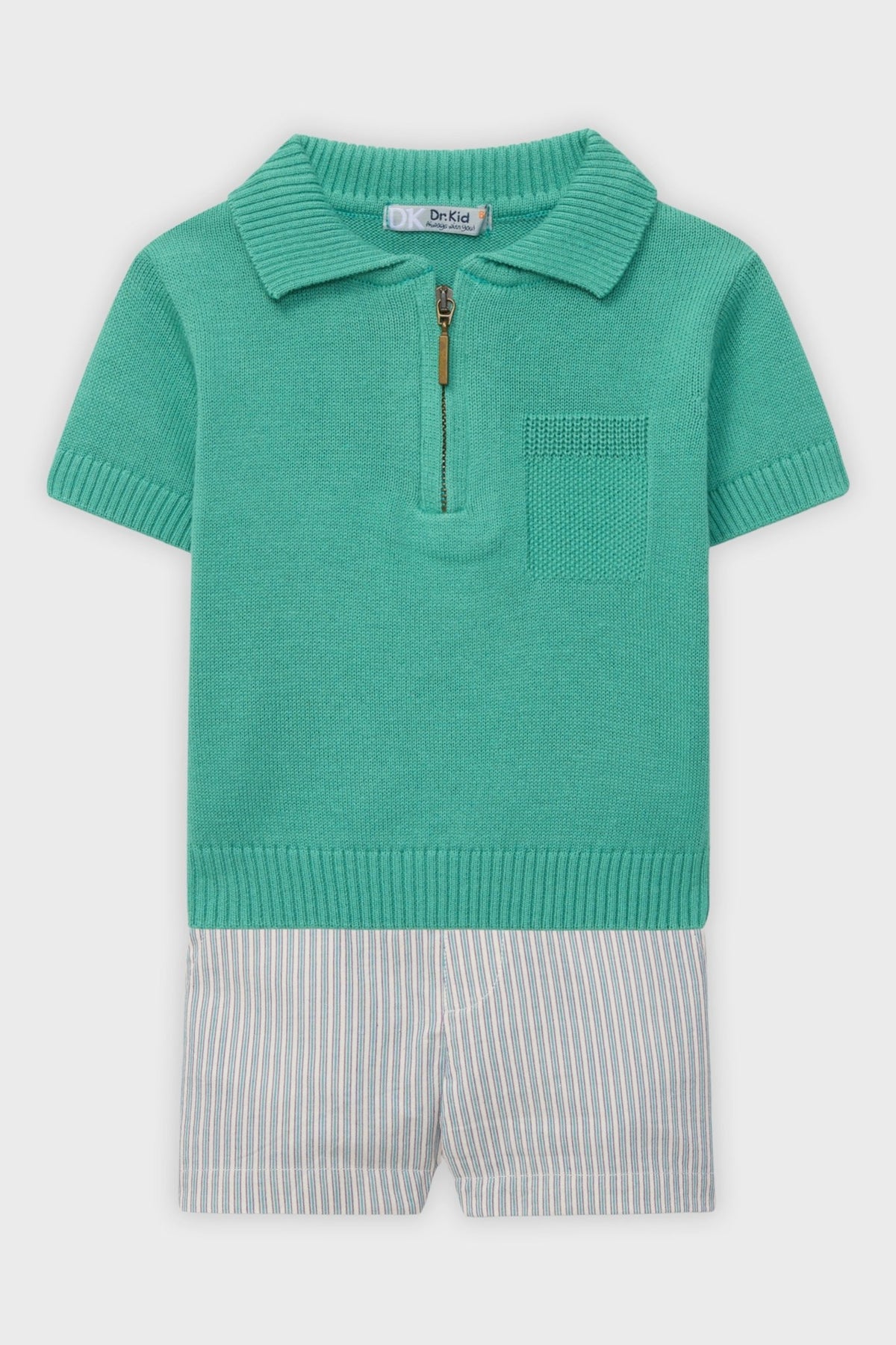 A classic summer look with a sporty twist! This Dr. Kid set is effortlessly stylish, featuring a fine knit polo shirt in a vibrant green hue with a trendy zip-up neckline and a subtle faux chest pocket. Paired with super lightweight striped shorts, in a fresh mix of white, green, and purple, this set is designed for comfort and style. The adjustable elasticated waist and popper fastening make the shorts easy to wear, ensuring a perfect fit for little ones on the go!