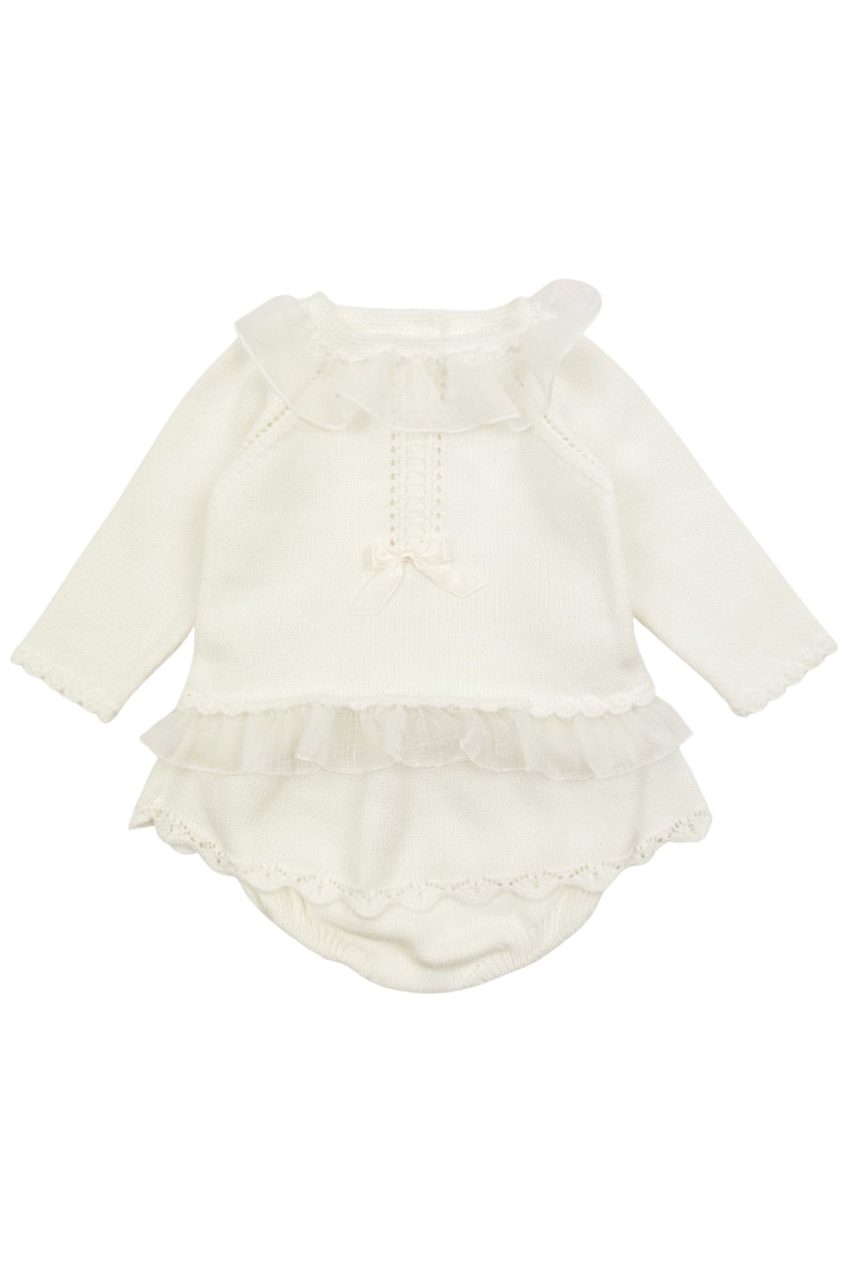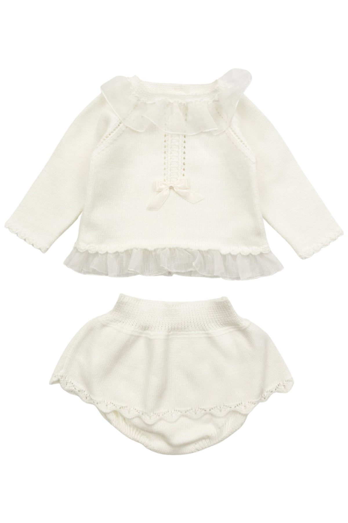 Baby girl's knit top and bloomers from Spanish brand Artesanía Granlei. Long sleeve top made from mid-weight ivory knit with pretty tulle frill to the neck and hem, paired with matching ivory knit bloomers. Finished with a cream satin bow to the top.
