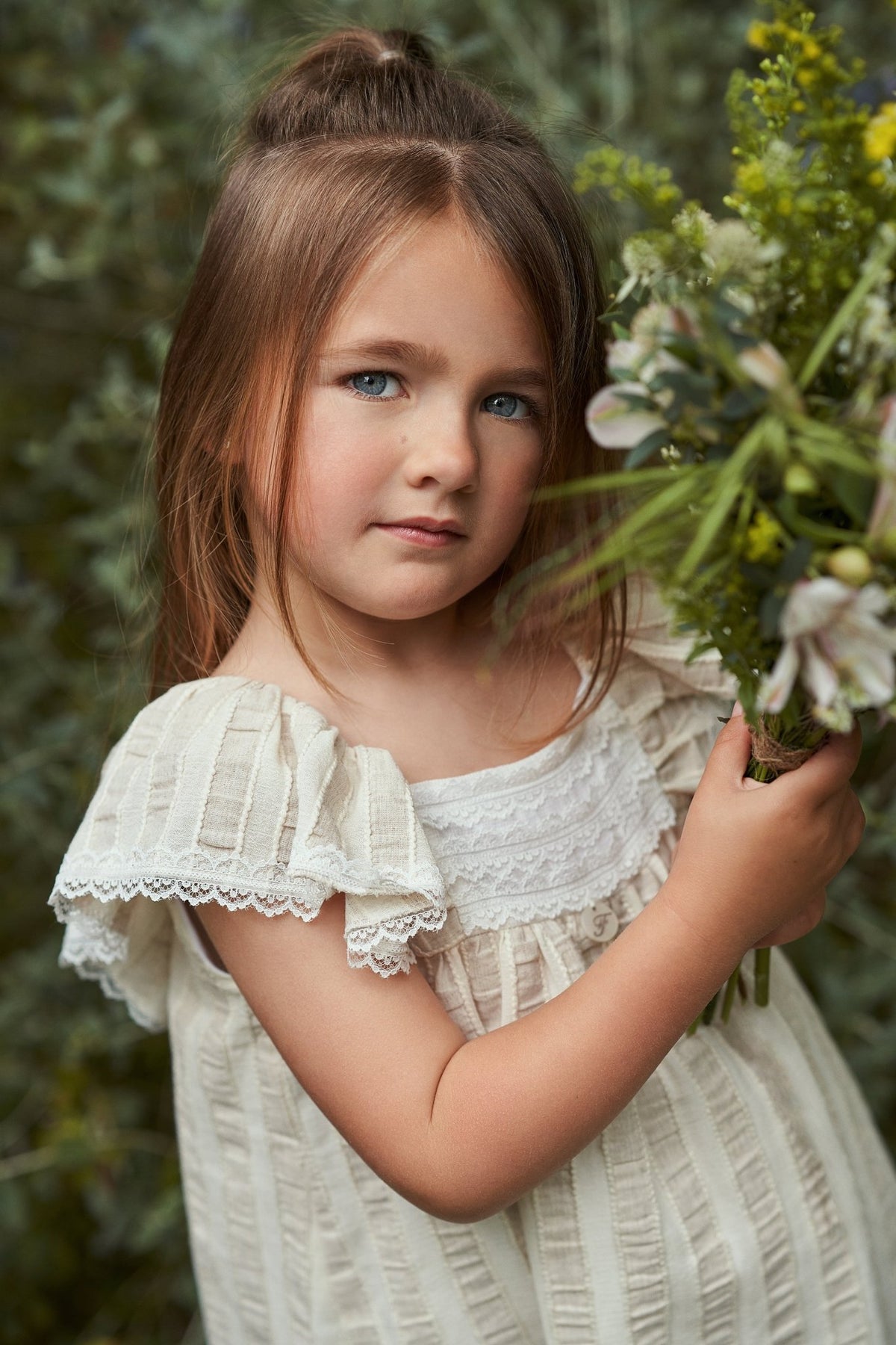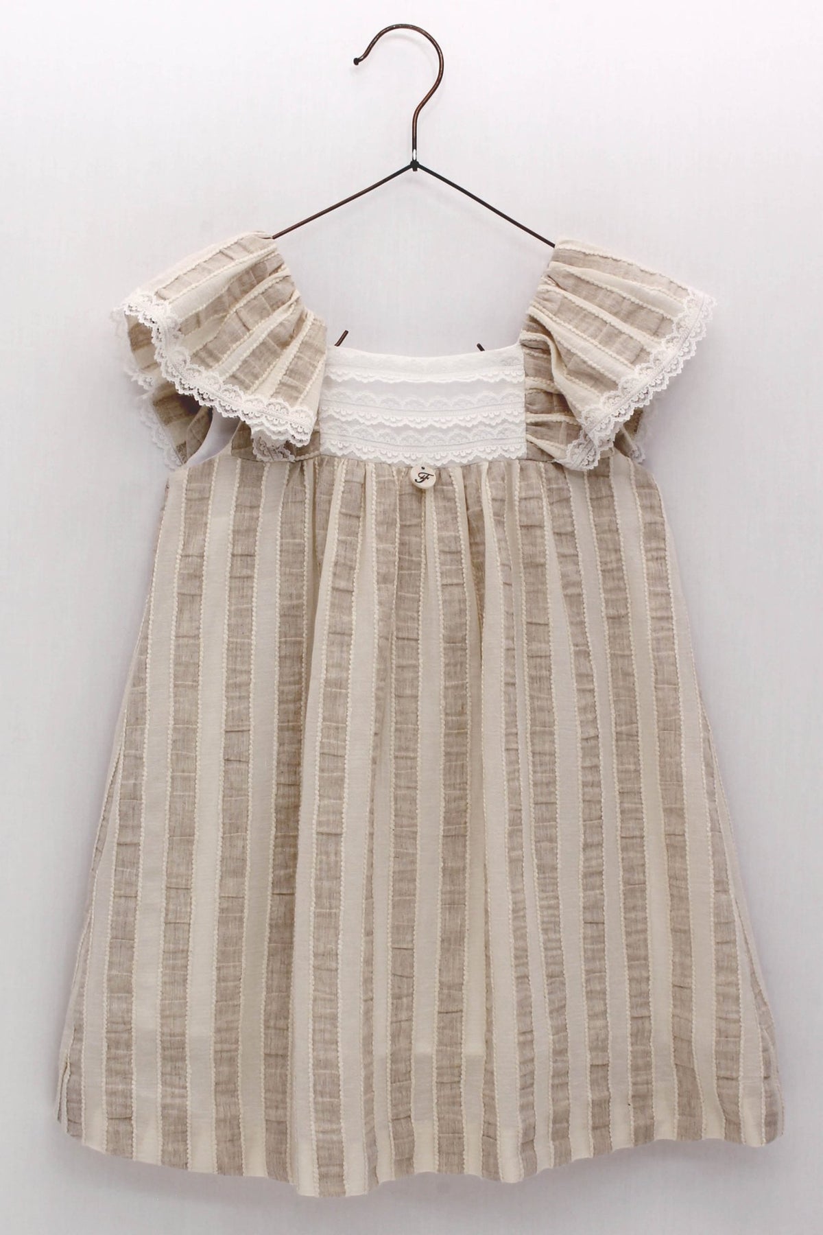 Girl's beige striped dress from Spanish brand Foque. Girl's cream and beige striped seersucker cotton dress with pretty ivory lace trim to the chest and stunning extra large lace trimmed sleeves. Perfect for those oh-so-special occasions, like weddings and christenings.