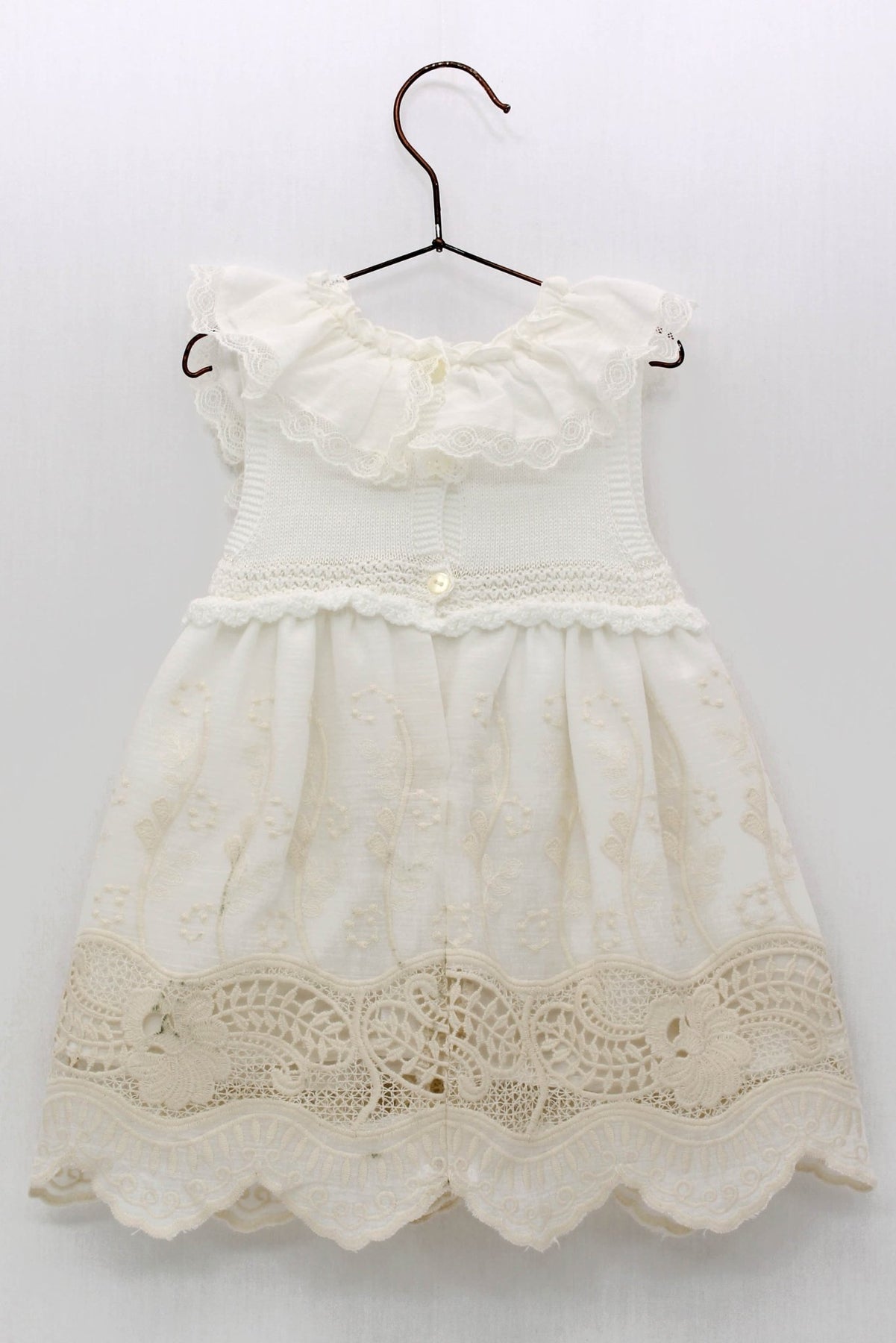 Baby girl's ivory lace dress from Spanish brand Foque. This adorable ivory knit dress for baby girls is adorned with a charming lace skirt and delicate ruffles trimmed with lace over the shoulders. The finishing touch? A luxurious natural mother of pearl disc with Foque's logo. It's an ideal choice for those oh-so-special moments, such as a christening or wedding.