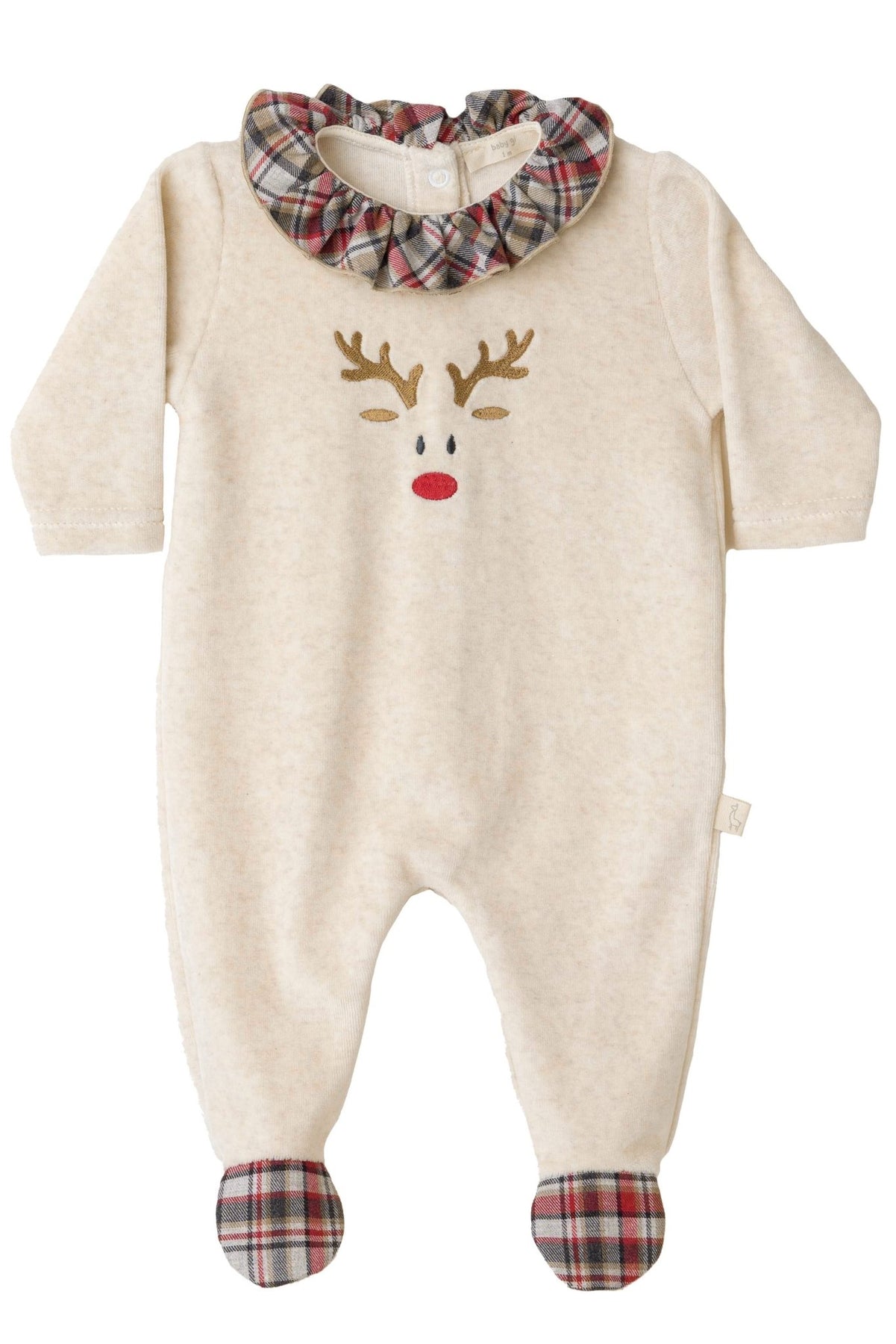 Baby girl's velour sleepsuit from Portuguese brand Baby Gi. Soft beige marl velour sleepsuit with red tartan cotton ruffle collar and toes, and adorable embroidered reindeer head to the chest.