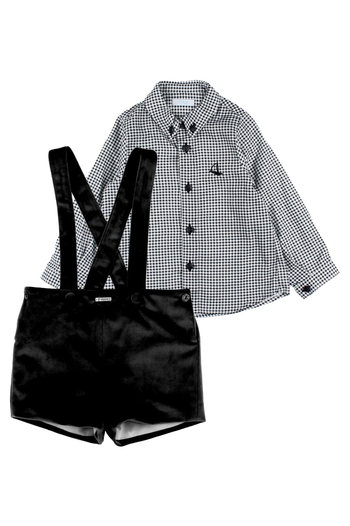 Boy's smart outfit set from Spanish brand Foque. Lightweight black and white gingham long-sleeve button-down collared shirt underneath super soft (like buttery soft!) black velvet shorts with removable braces.