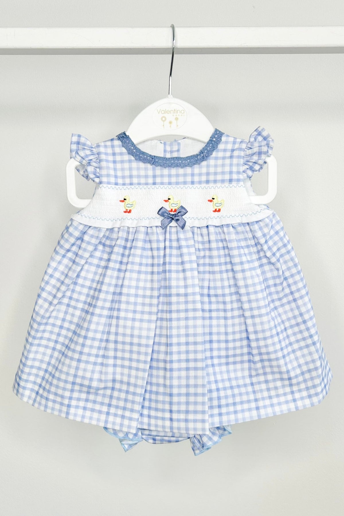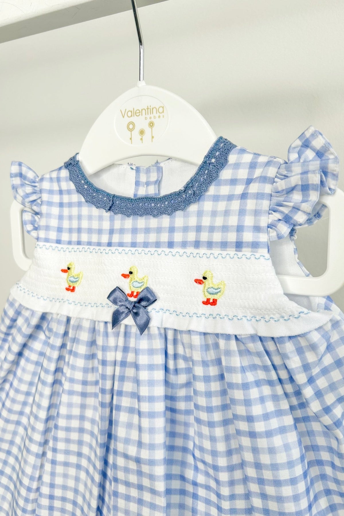 Sweet, traditional and full of charm, this dress and bloomers set by Valentina Bebés is perfect for sun-soaked strolls and special summer days. Made from soft blue and white gingham cotton, the dress features smocking across the chest with three cheerful embroidered ducks, finished with a dusky blue satin bow at the centre. Delicate flutter sleeves and a gently flared skirt add a timeless silhouette. It comes with matching gingham bloomers for an effortlessly adorable look from head to toe.