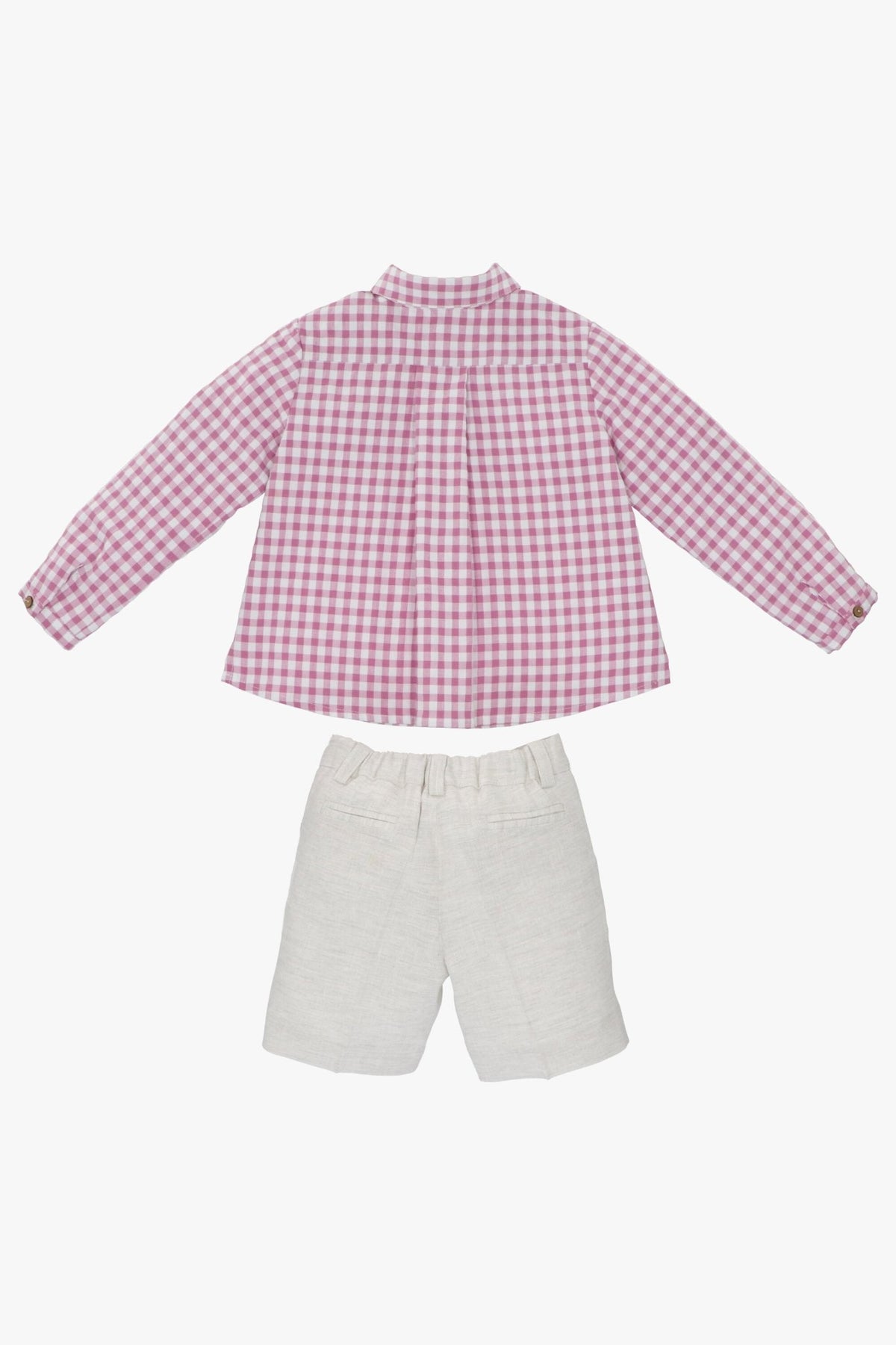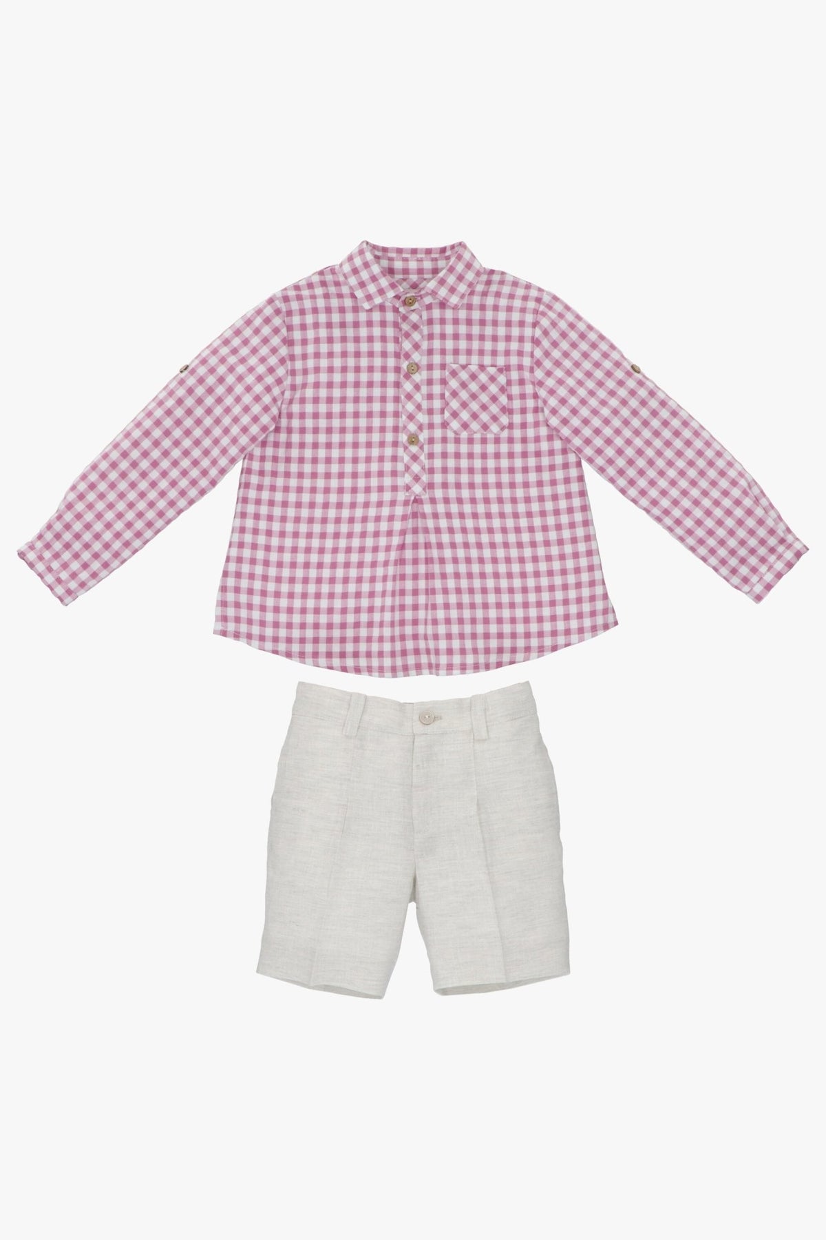 Boy's outfit set from Spanish designer Martín Aranda. Super lightweight orchid purple seersucker gingham long sleeve cotton-blend shirt paired with smart linen-blend shorts. Cork button fastening to sleeves so they can be worn long or rolled up.
