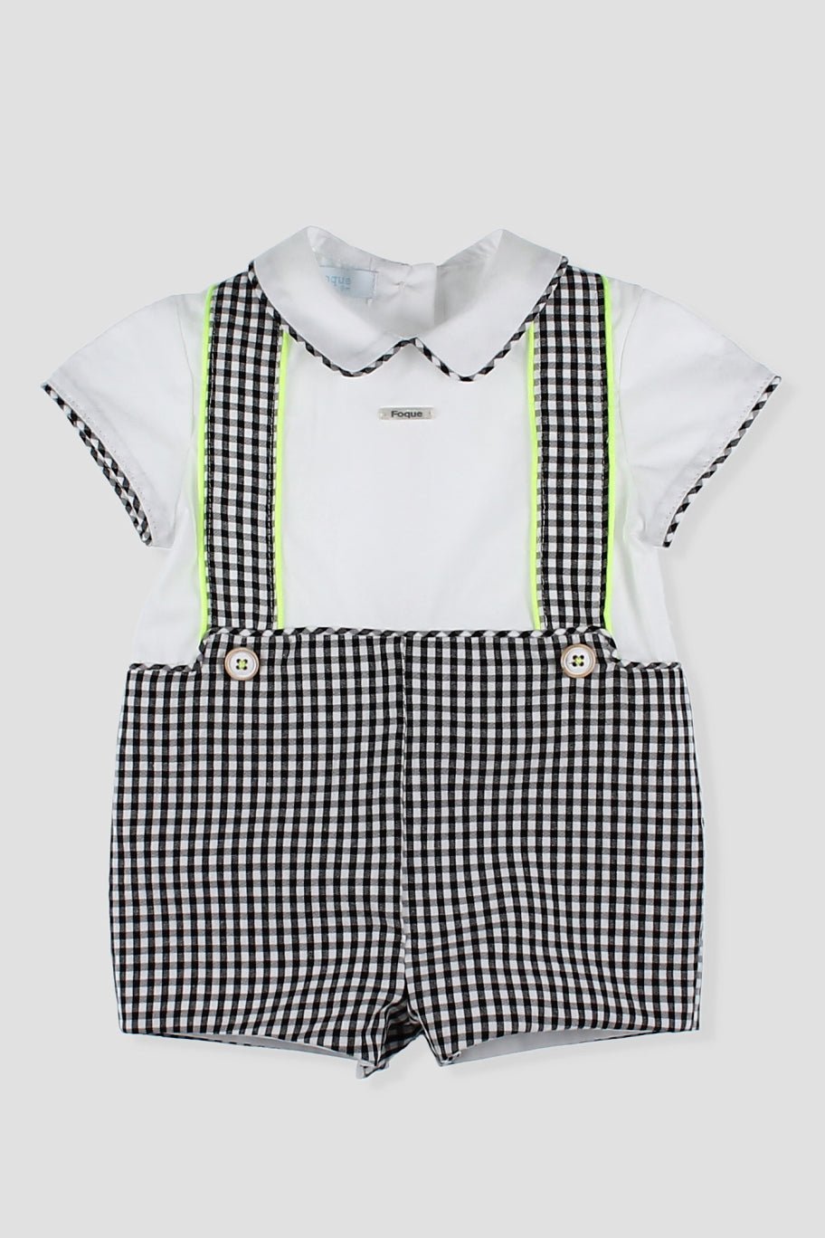 Classic with a bold twist, this baby boy romper by Foque is a standout piece for summer. Designed to look like a shirt and braces set, it features a lightweight white top with a peter pan collar and mock black-and-white gingham shorts. Neon lime piping adds a playful pop of colour, while button fastenings at the back and between the legs ensure easy changes. Fully lined for comfort, it’s a dapper look with a fun, modern edge.