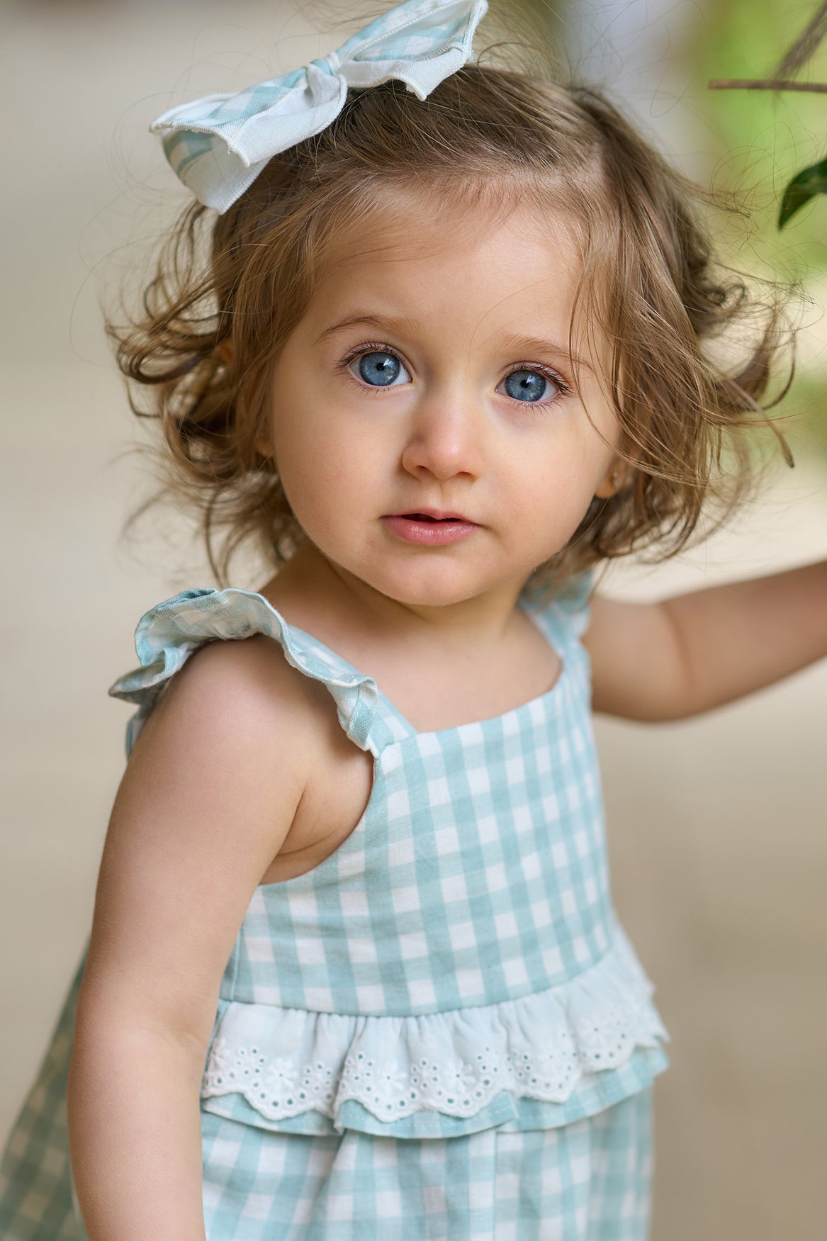 This adorable romper from Rapife features a charming sage green and ivory gingham pattern, made from a soft, lightweight linen blend. The romper is adorned with sweet ruffles on the straps and a layered broderie anglaise ruffle at the waist, adding a delicate touch. Elasticated legs ensure comfort and ease of movement. It has popper fastenings to the back and crutch, making it convenient for dressing and nappy changes. Perfect for warm days, this romper is a stylish choice for any occasion.